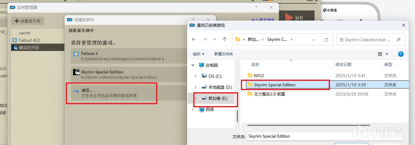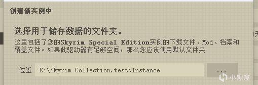 命名後,創建實例的存儲目錄,這裏建議在Skyrim Collection下建一個Instance文件夾,這個目錄是用來存儲我們的mod文件的,所以一定要選一個自己能記得到的位置
