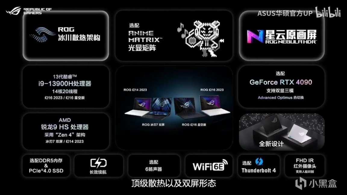 在今晚7点30分,ROG召开CES2023的全球发布会,游戏本系列包括ROG冰刃、魔霸、枪神,全能本系列包含幻16、幻14、幻13和幻X系列,全系笔记本配置均得到了更新升级!关注度最高的游戏本,屏幕方面升级为16/18英寸的全新尺寸,首发酷睿i9处理器,同时独占搭载R9 7945HX处理器。