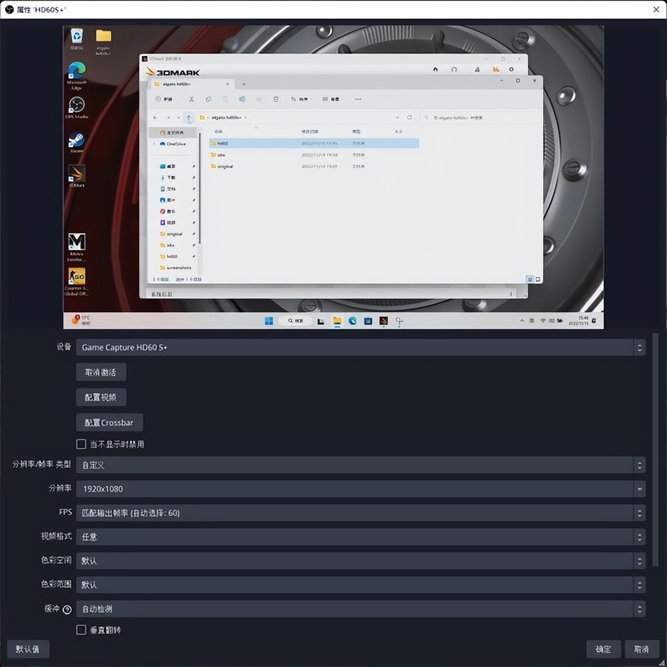 HD60S +采集卡默认支持1920x1080@60Hz的视频采集(注意不支持1920x1200)。添加好视频源后,试试显示另一台视频输出电脑上的屏幕内容,不管是录像还是推流大家可以在OBS中任意设置,简单方便。