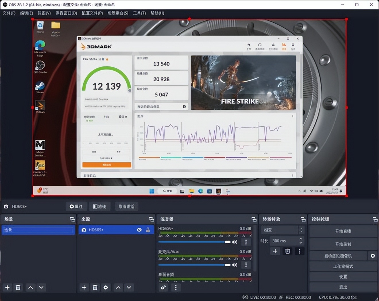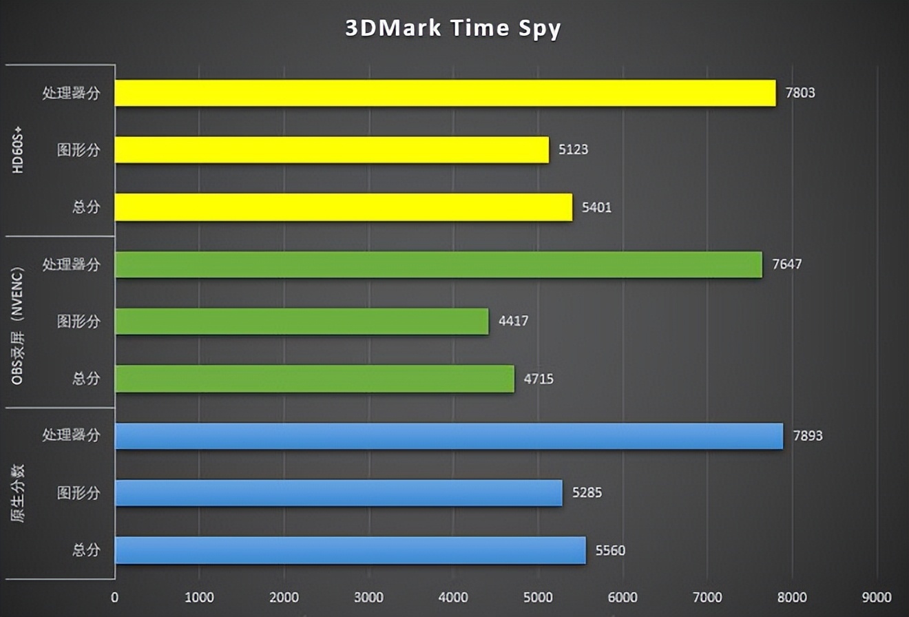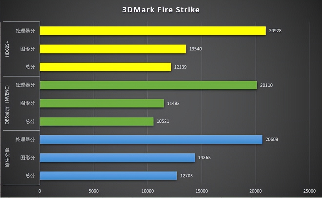 相信很多人认为使用采集卡后对设备性能不会造成任何影响,其实这一理论并不完全正确,具体原理本人也不是很清楚,但至少在PC端测试多次后依旧会有不同程度的性能下降。反倒是主机上没有出现这一问题,或者是主机没有Benchmark无法体现出来。不过好在性能下降的幅度很小,相比较采用OBS单机直录的效果要强上很多。具体性能表现如下: