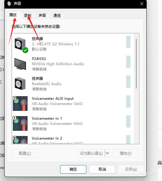 在播放和录制这两个选项里选择自己的麦克风和耳机,并且勾选右下角的设为默认。