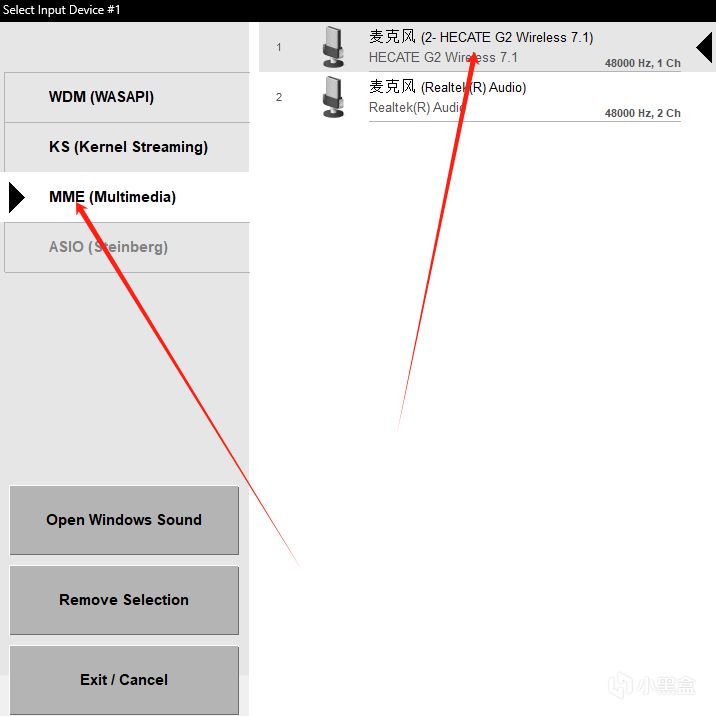 然后点击左上角的1和右上角的A1,选择MME,选择自己的麦克风(这里是左边的1)