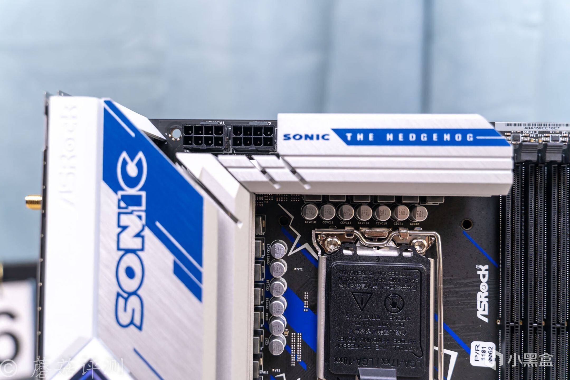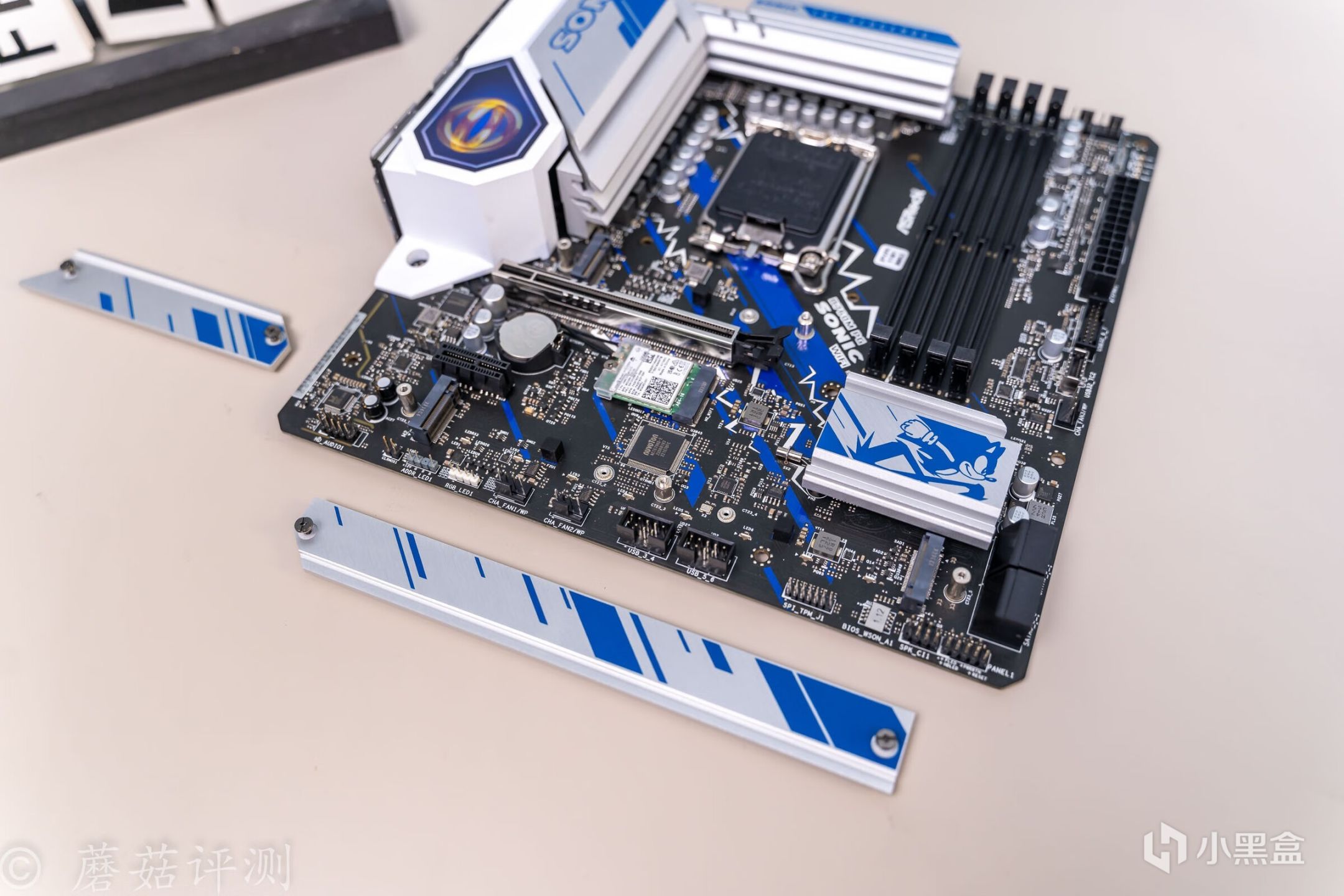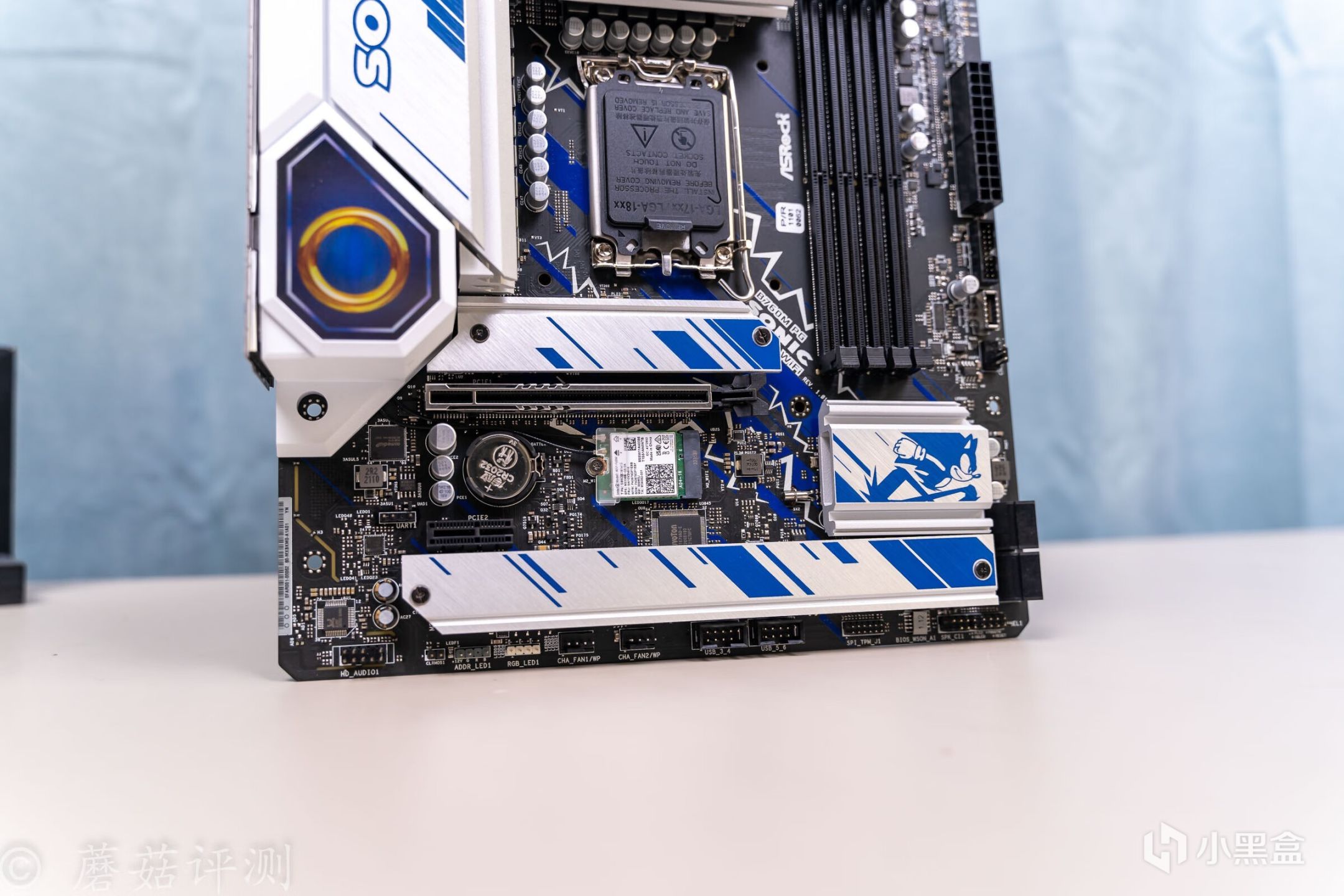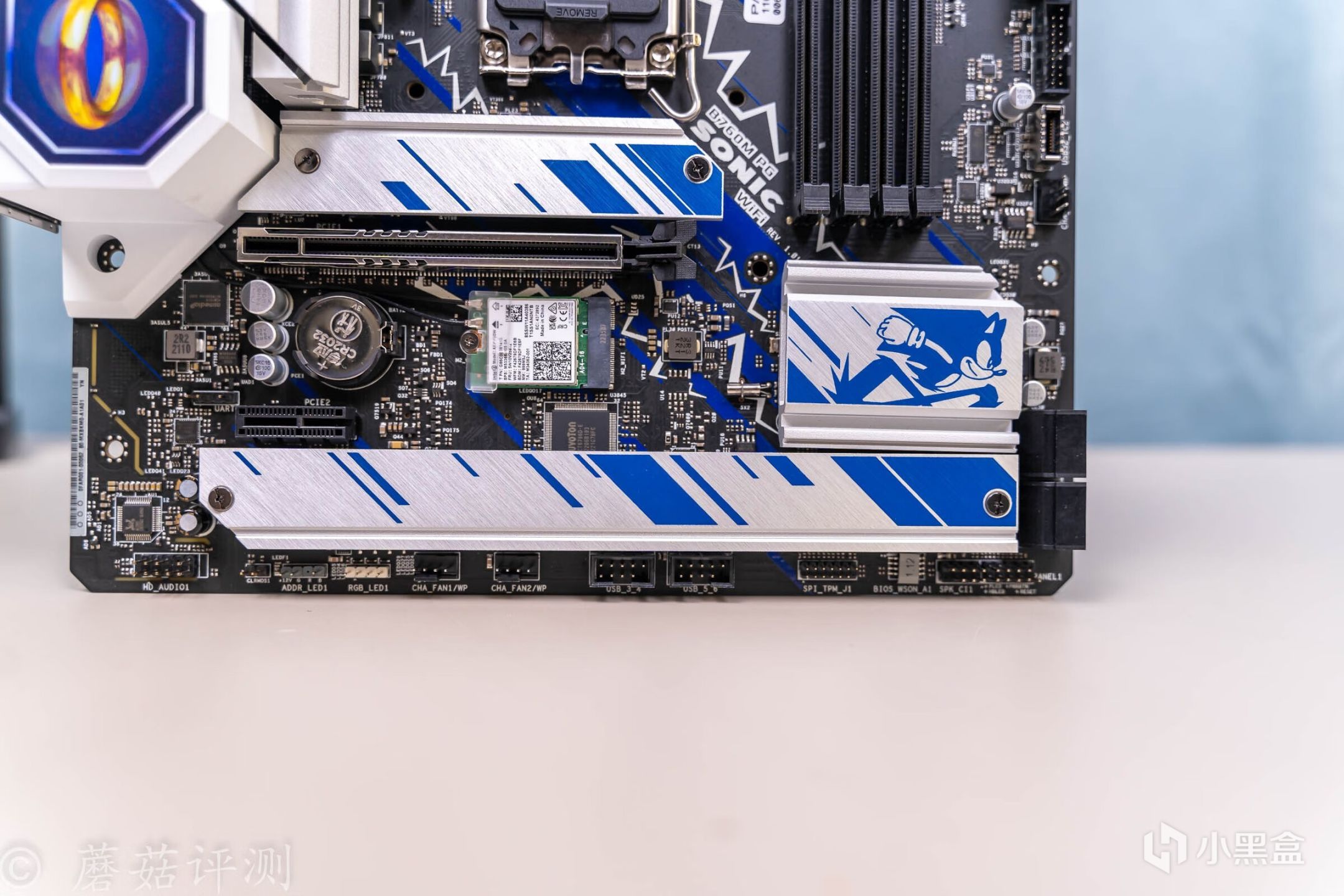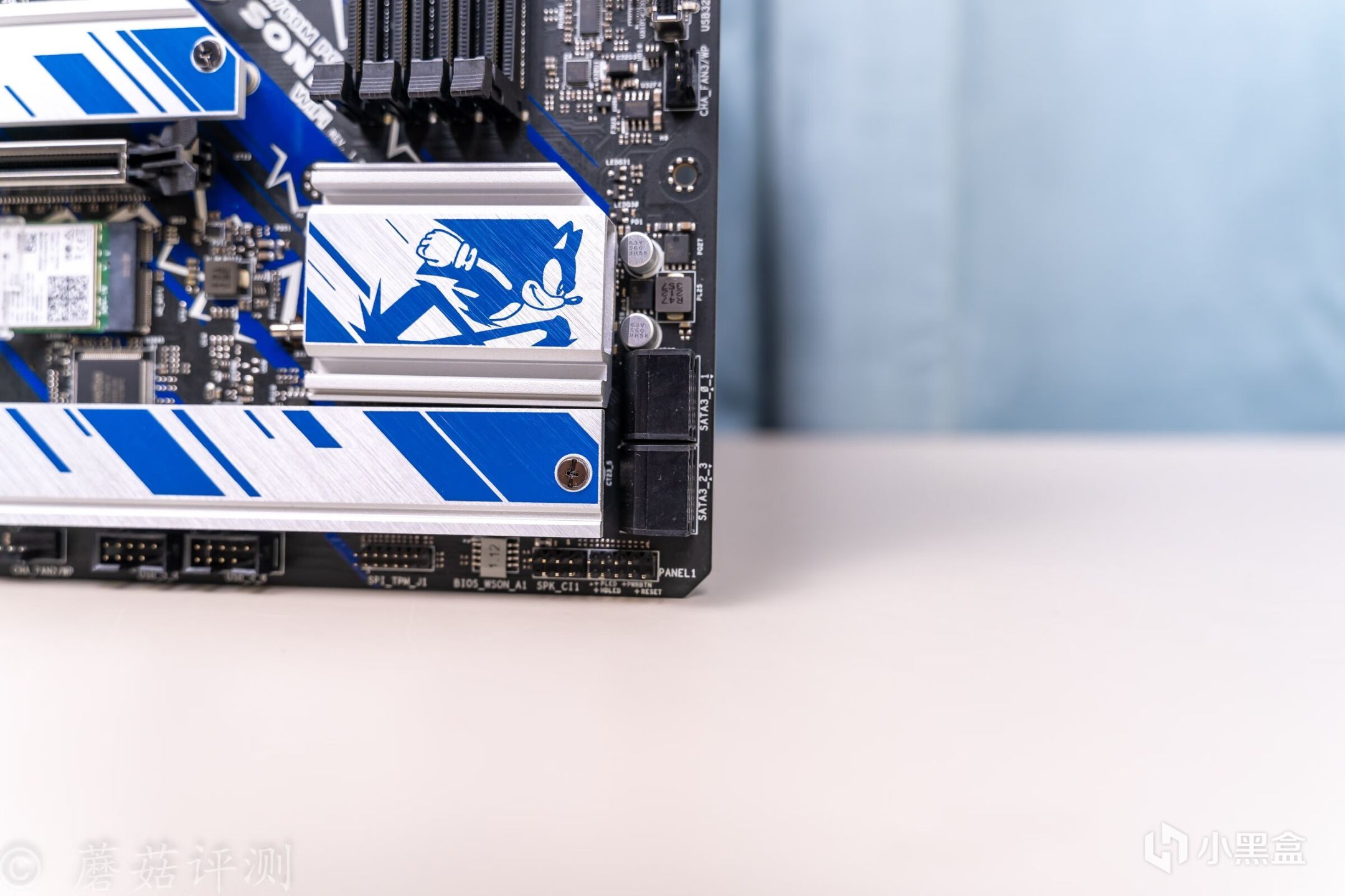 ▼主板的外观非常漂亮,正面覆盖有大量蓝白配色的金属件,而蓝色就是索尼克的标志性配色。