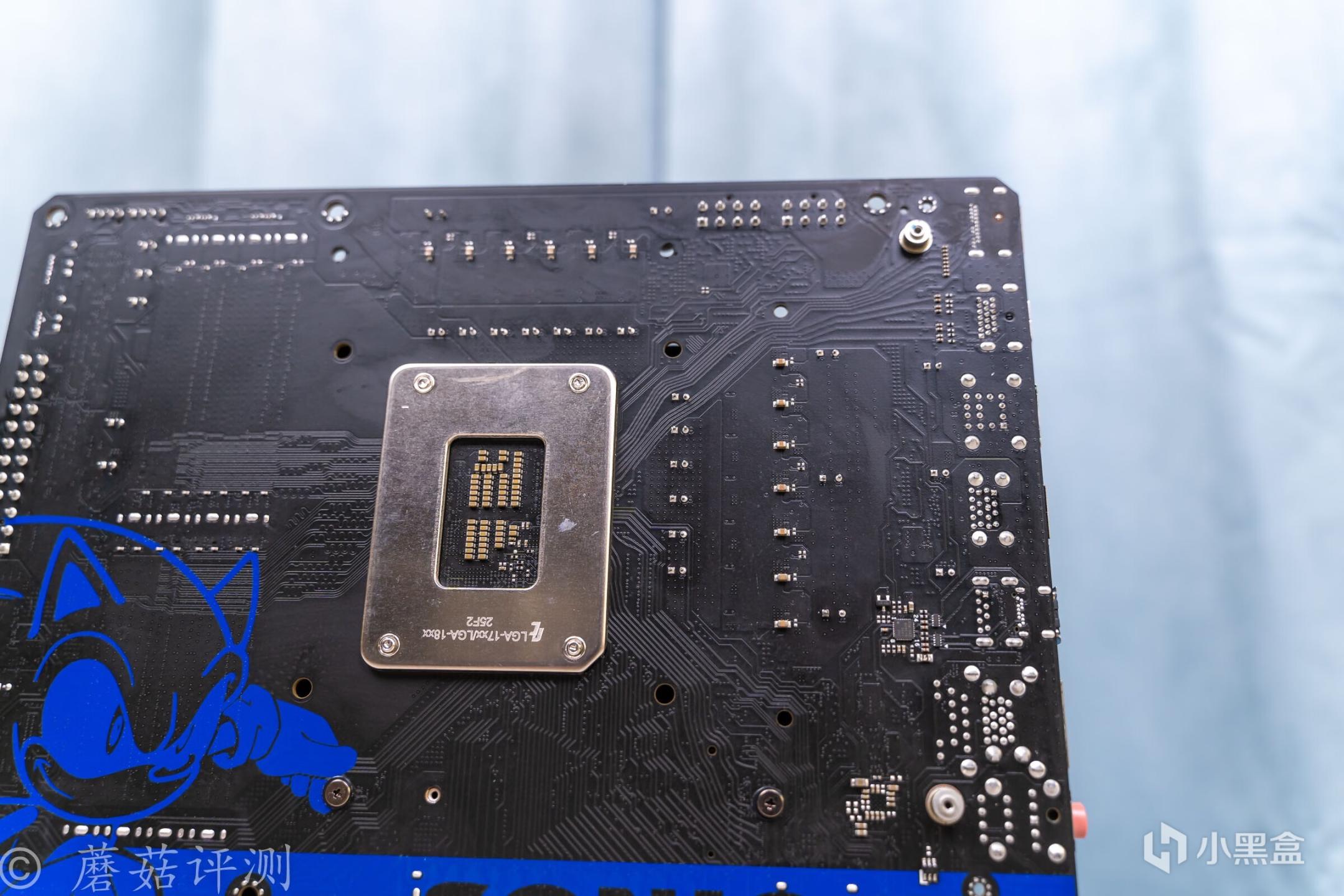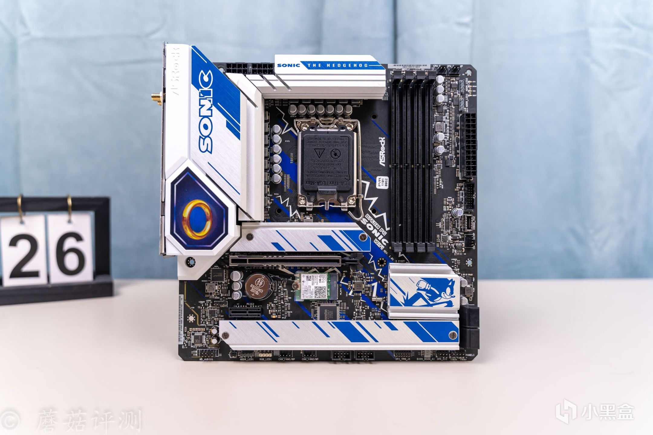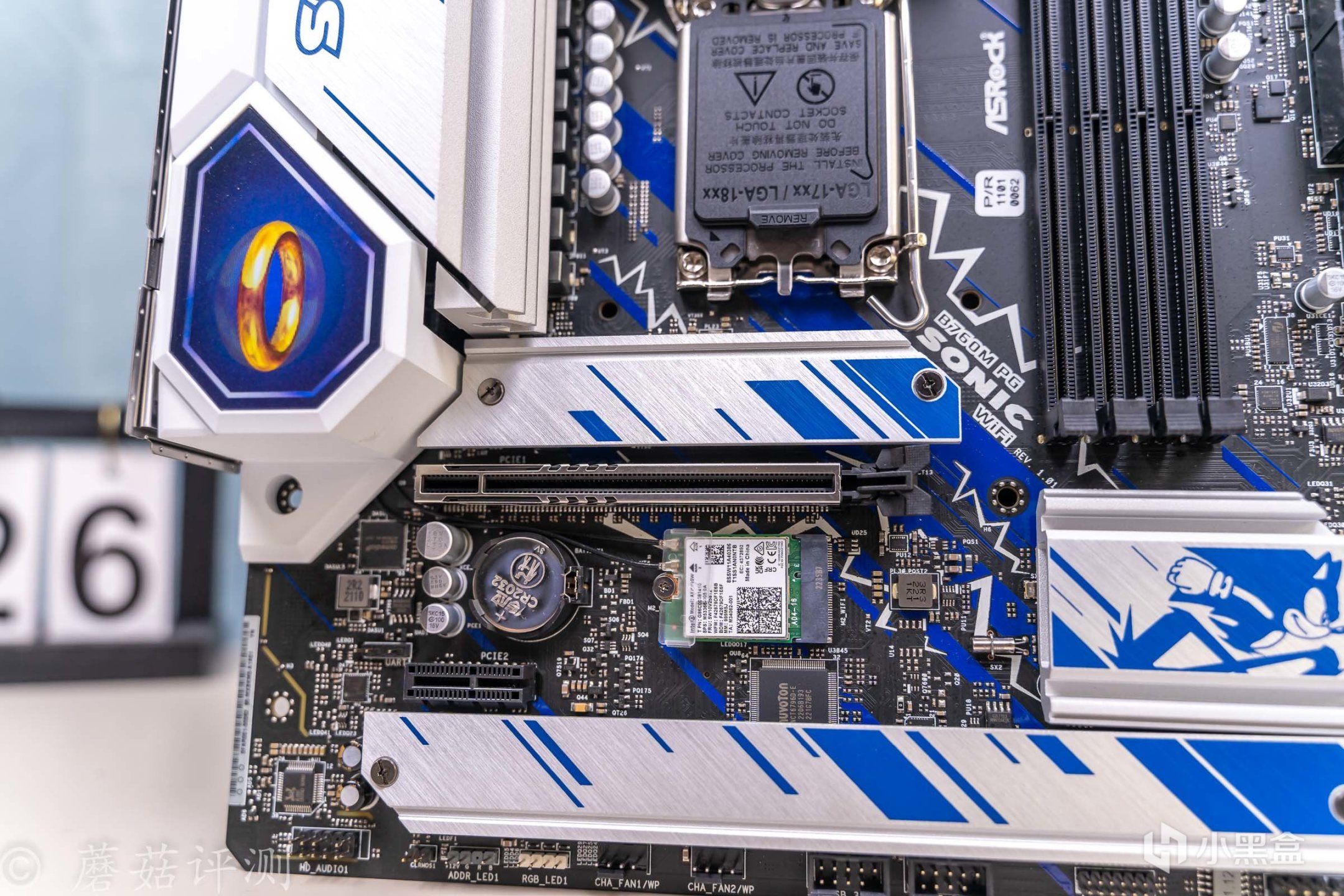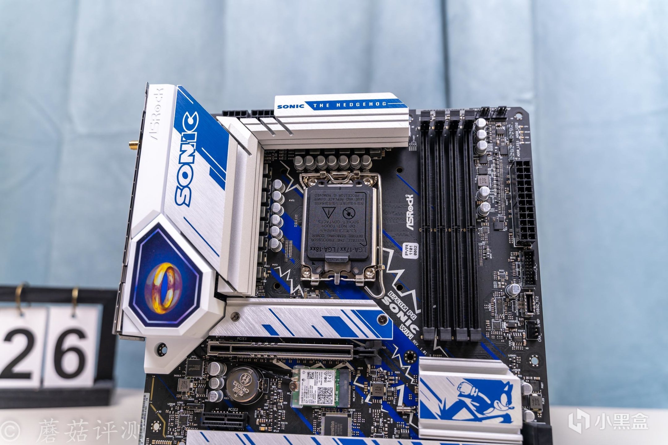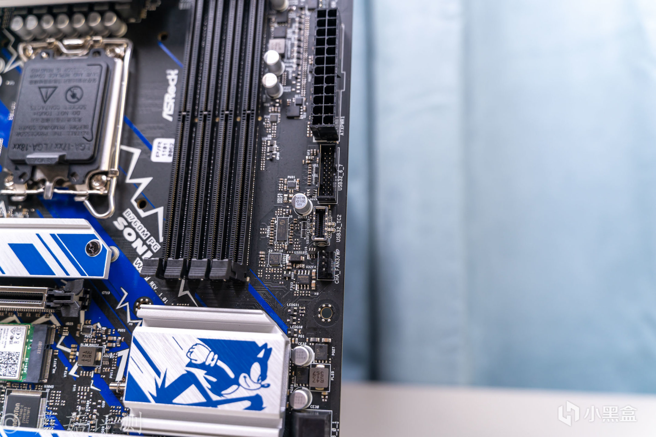 ▼主板的外观非常漂亮,正面覆盖有大量蓝白配色的金属件,而蓝色就是索尼克的标志性配色。