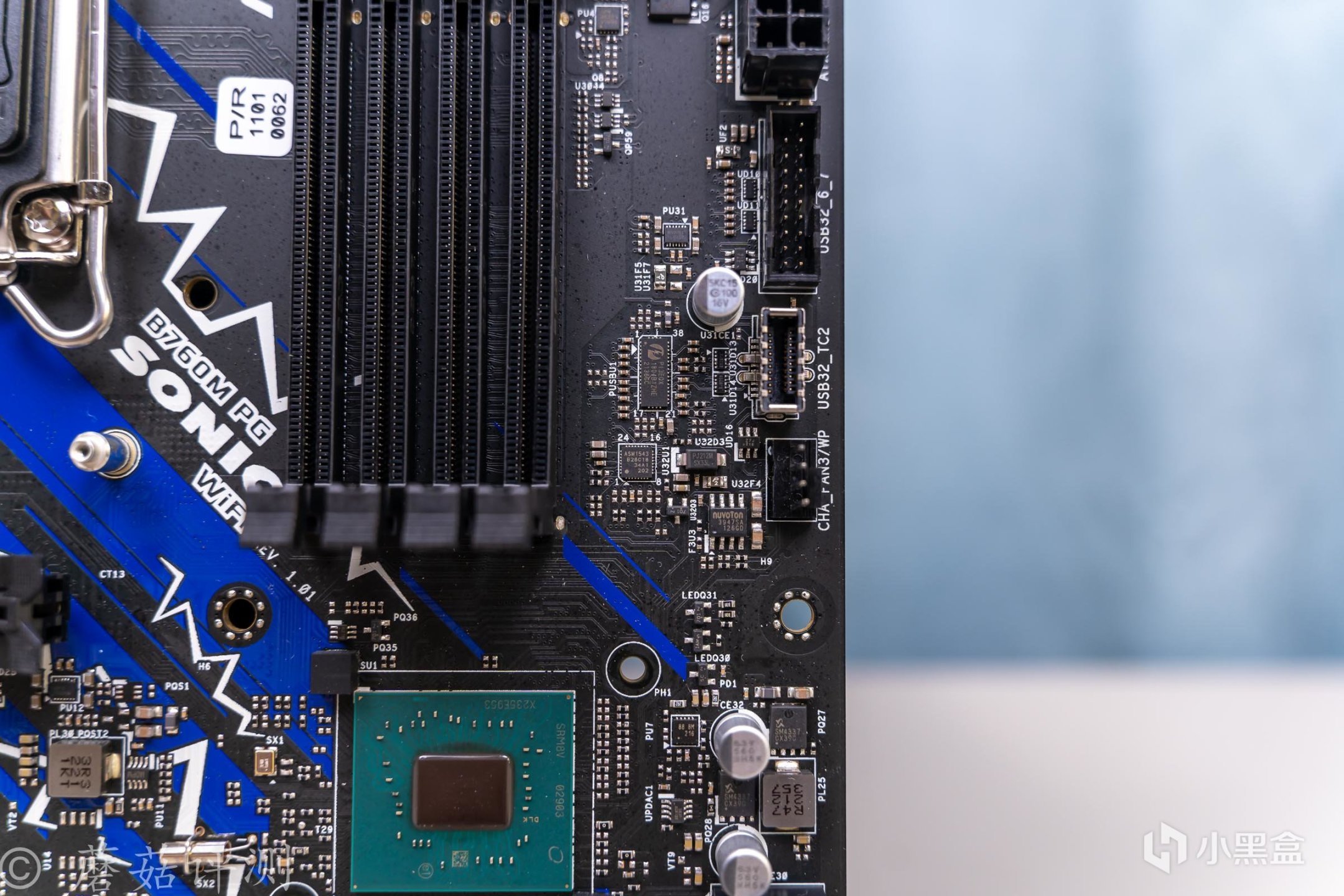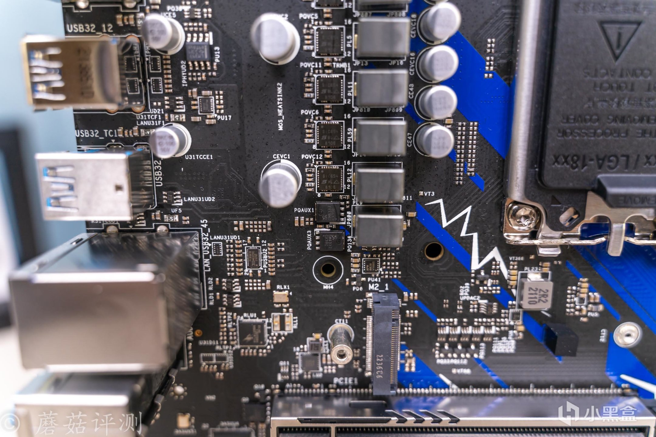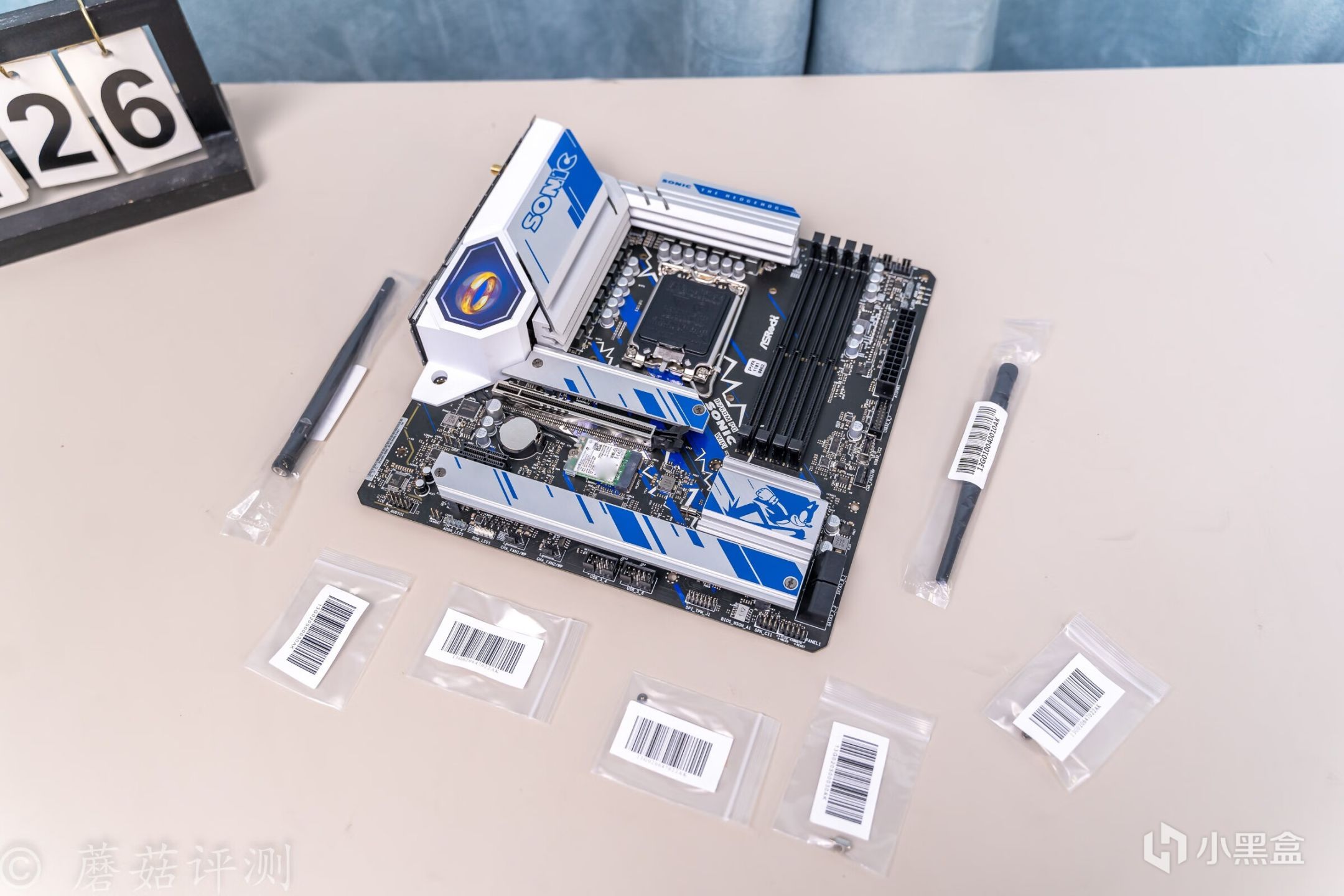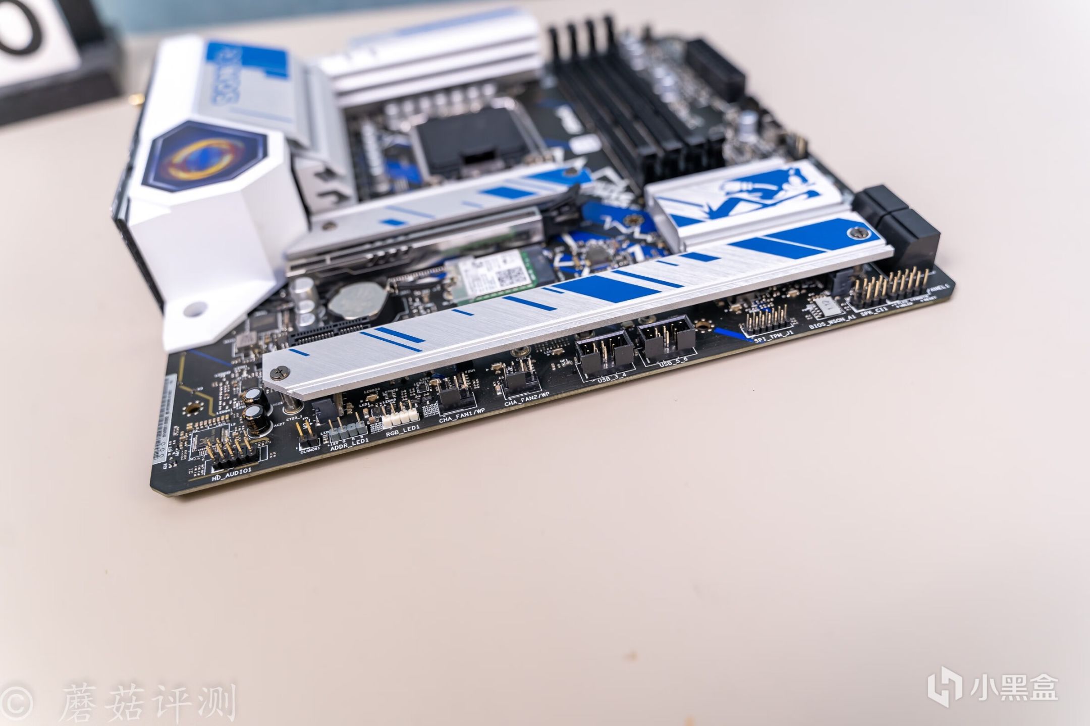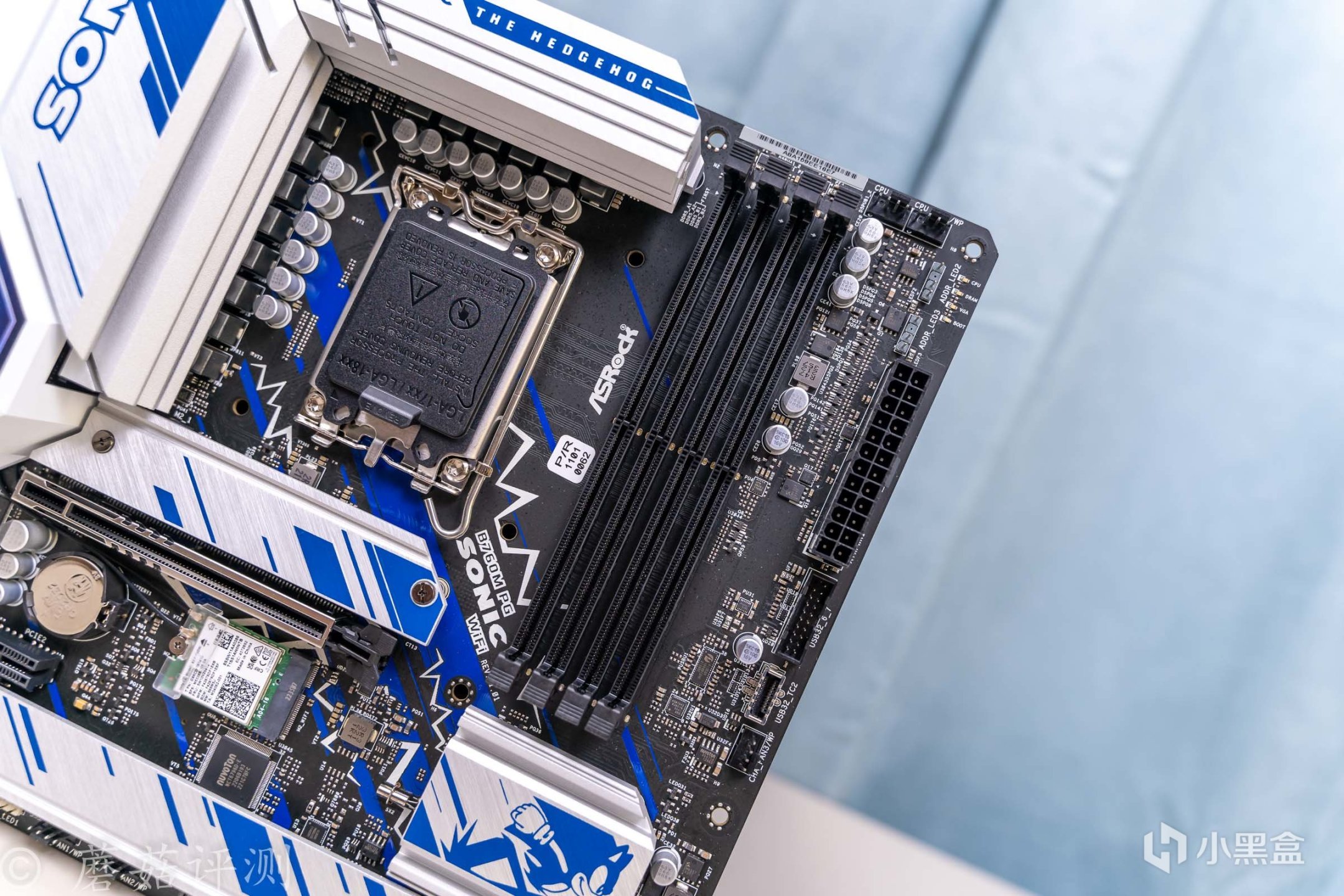 ▼主板的外观非常漂亮,正面覆盖有大量蓝白配色的金属件,而蓝色就是索尼克的标志性配色。