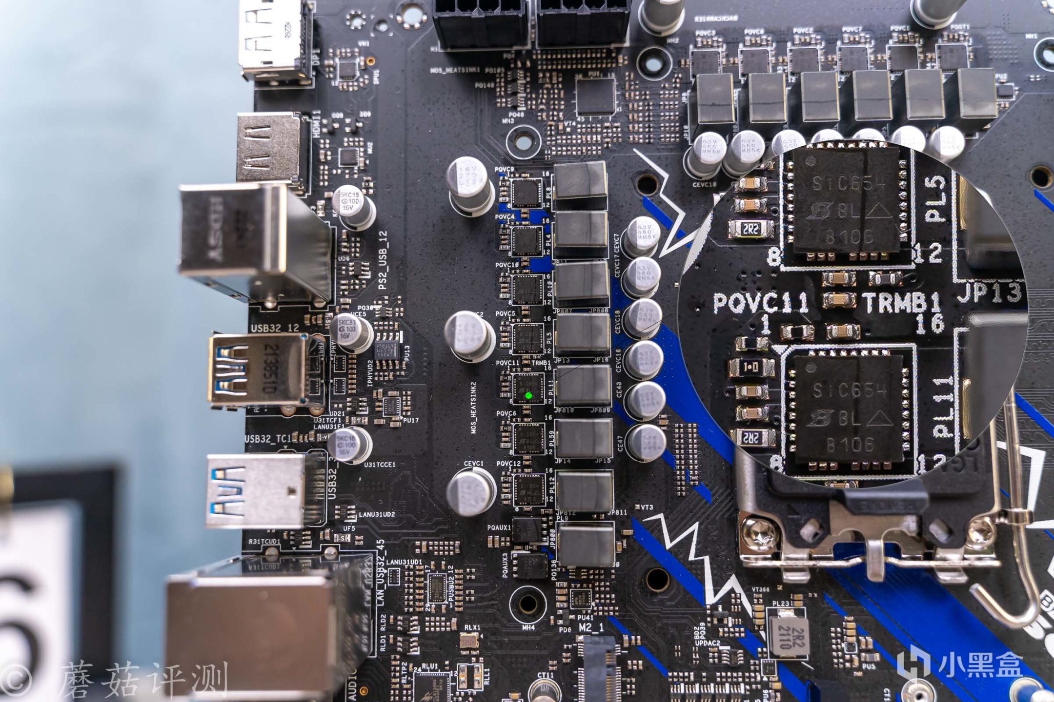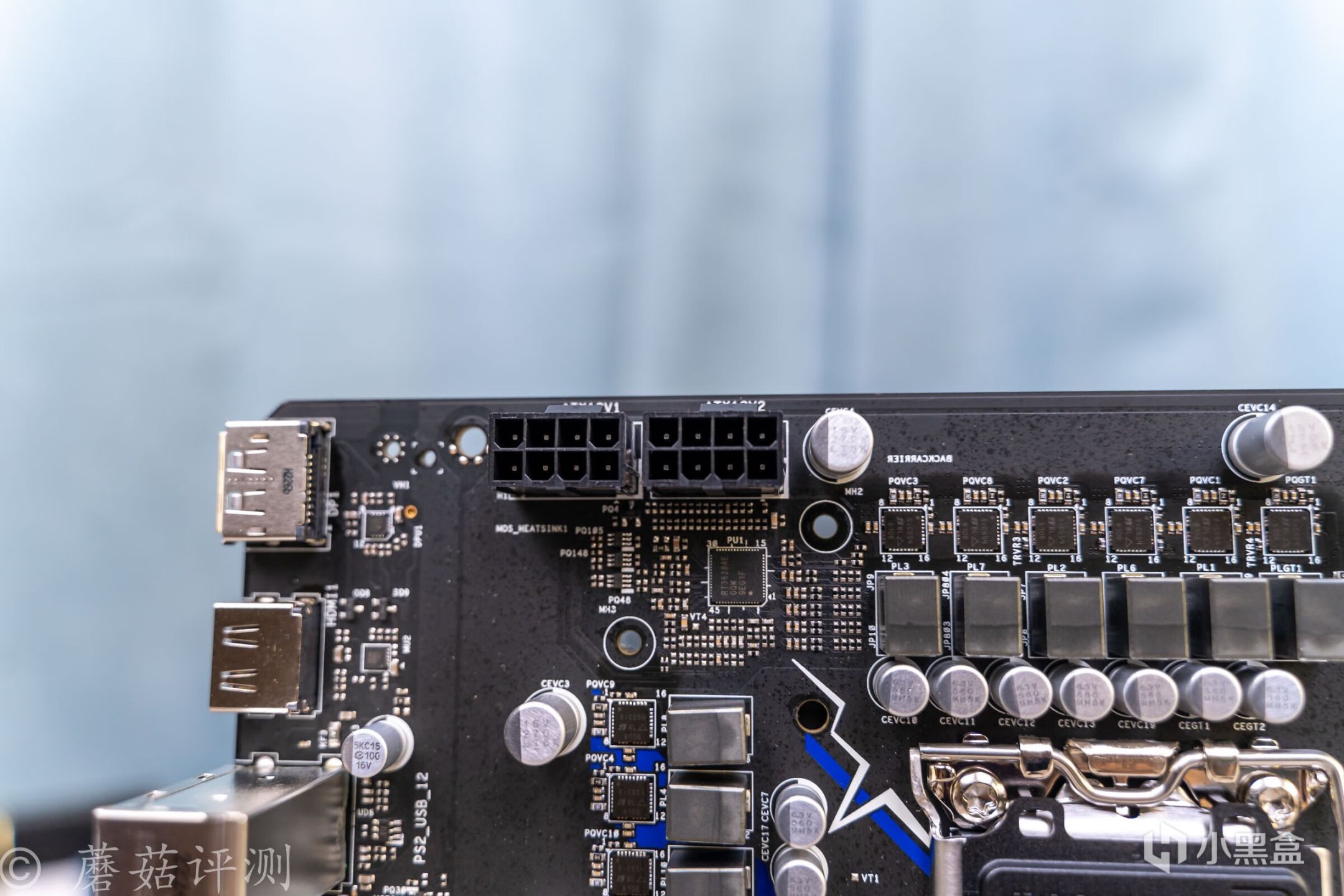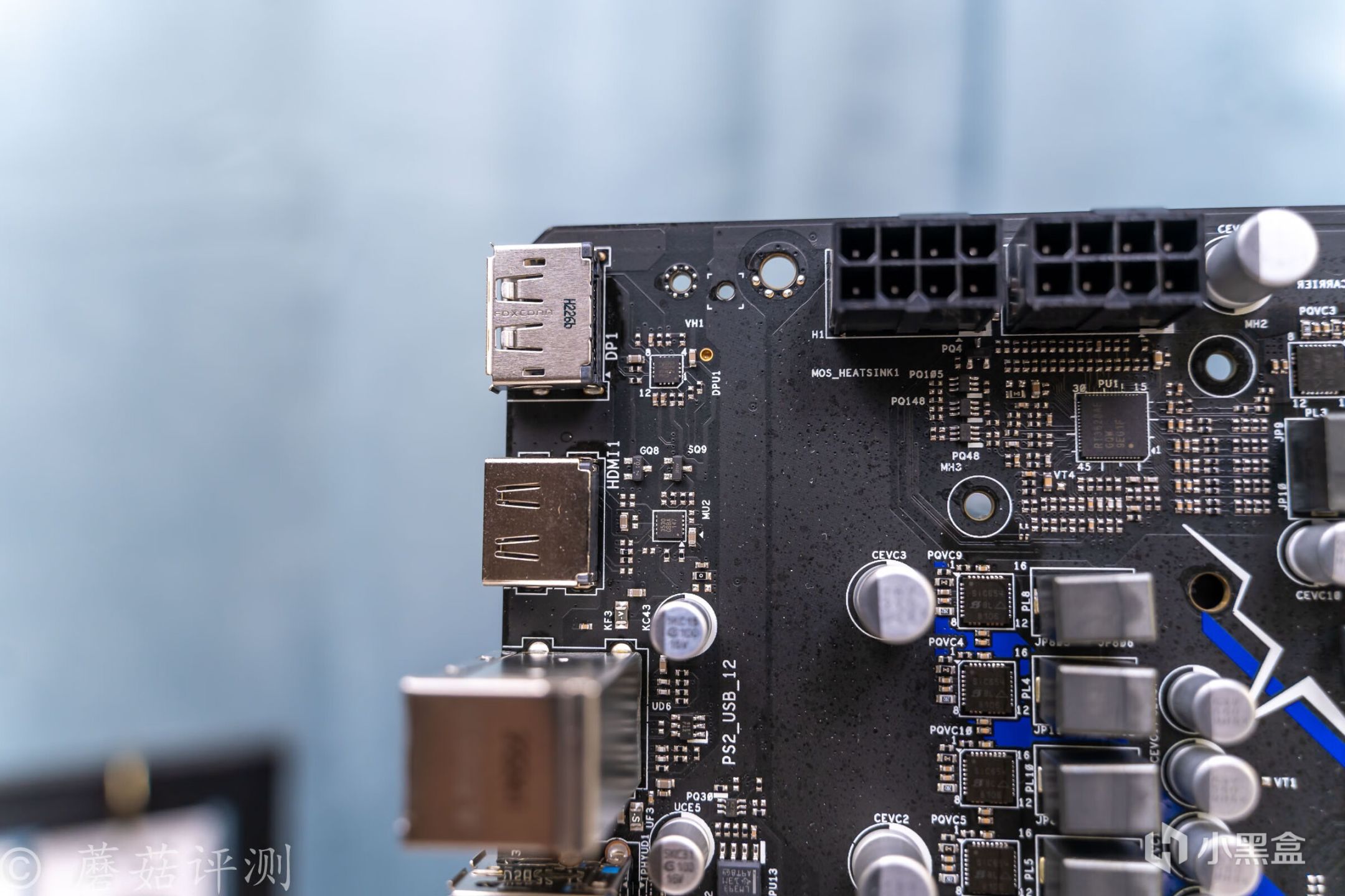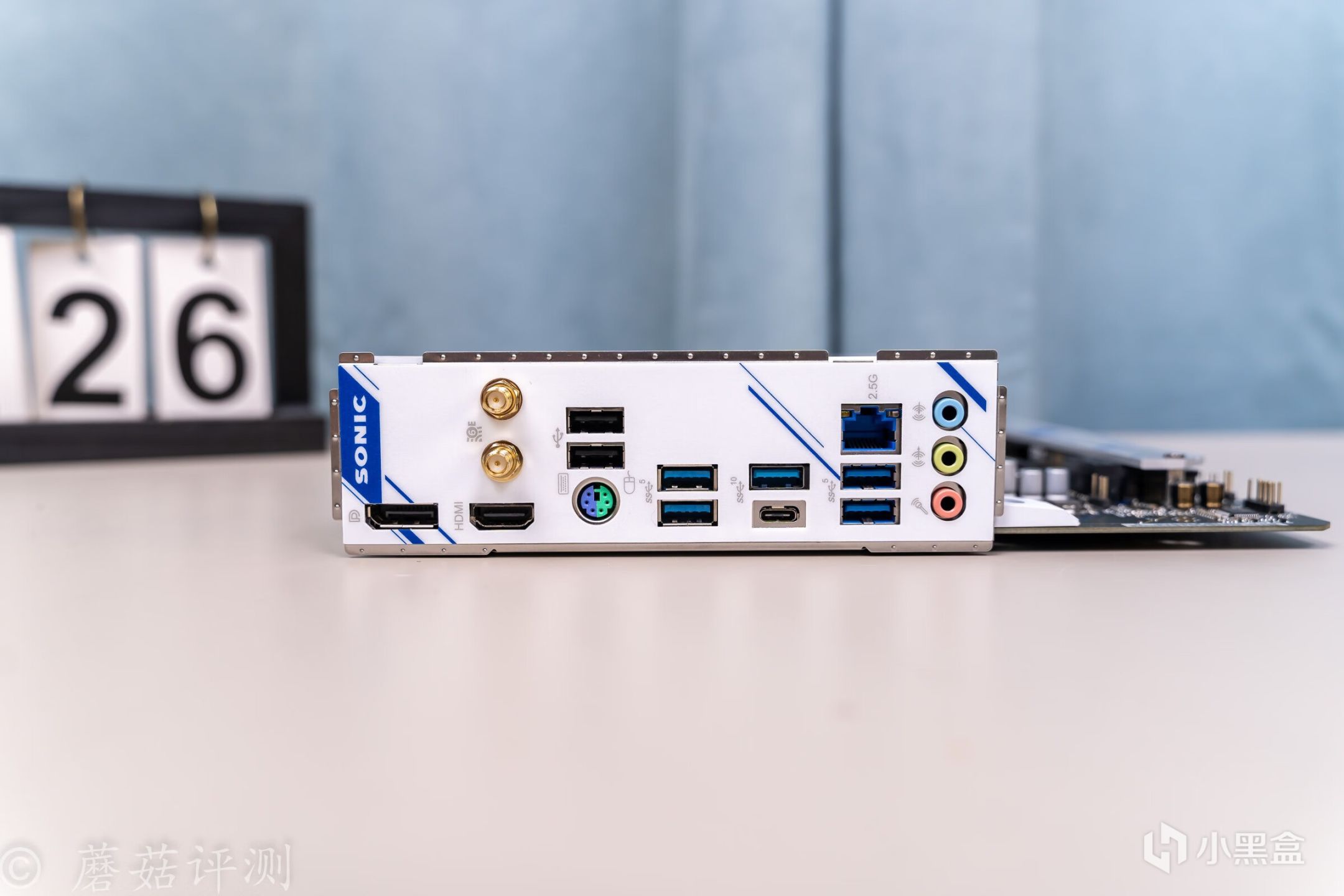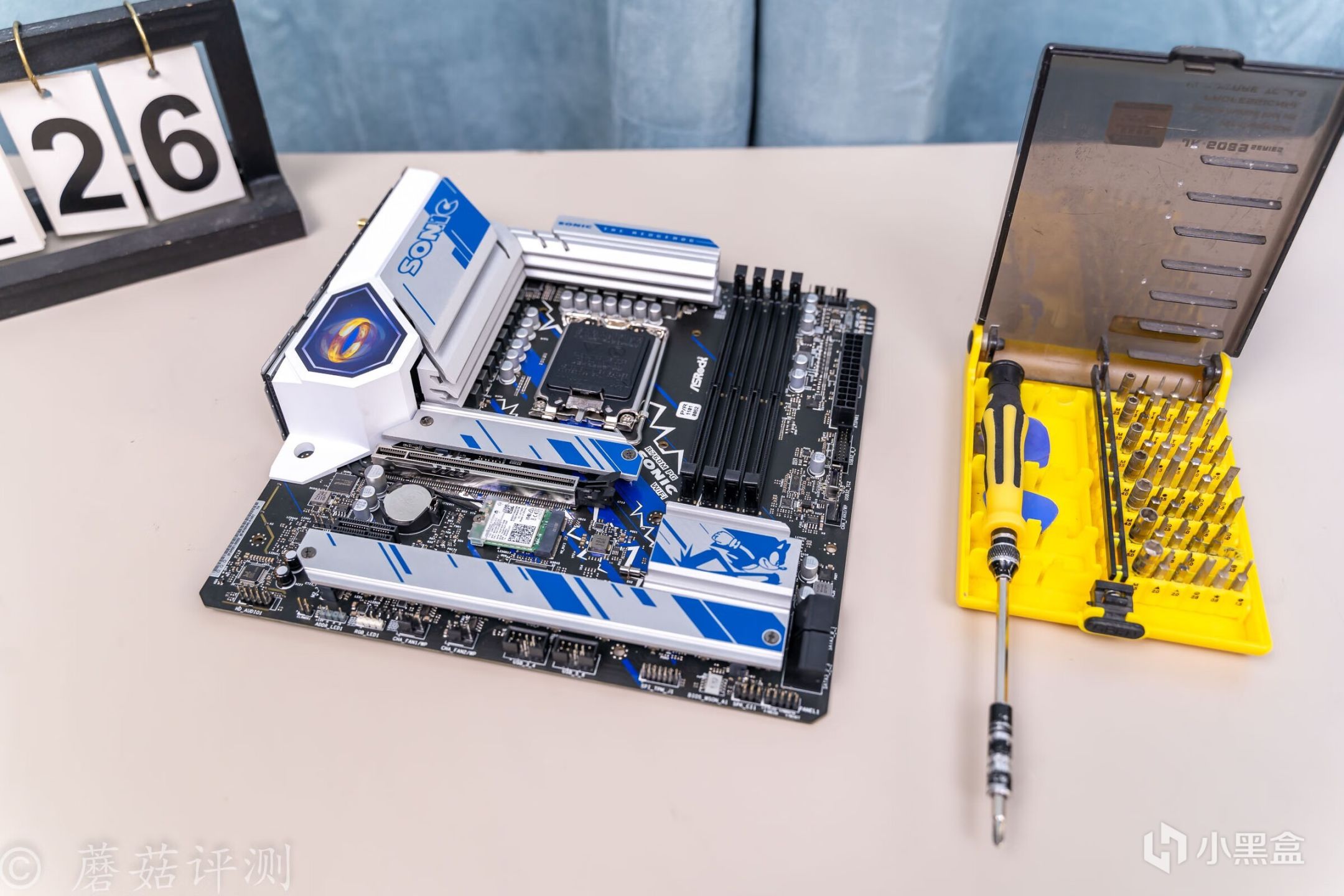 ▼主板的外观非常漂亮,正面覆盖有大量蓝白配色的金属件,而蓝色就是索尼克的标志性配色。