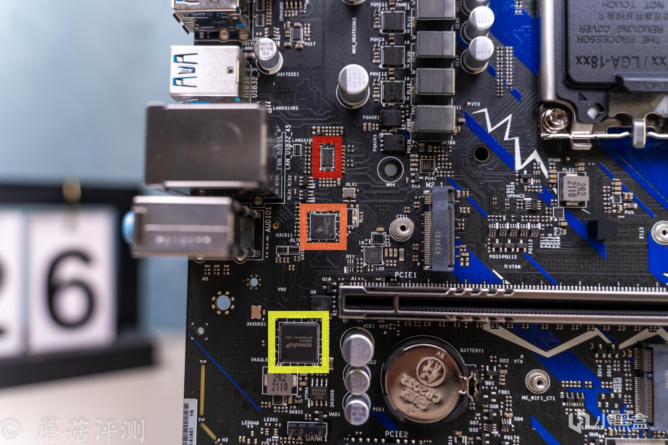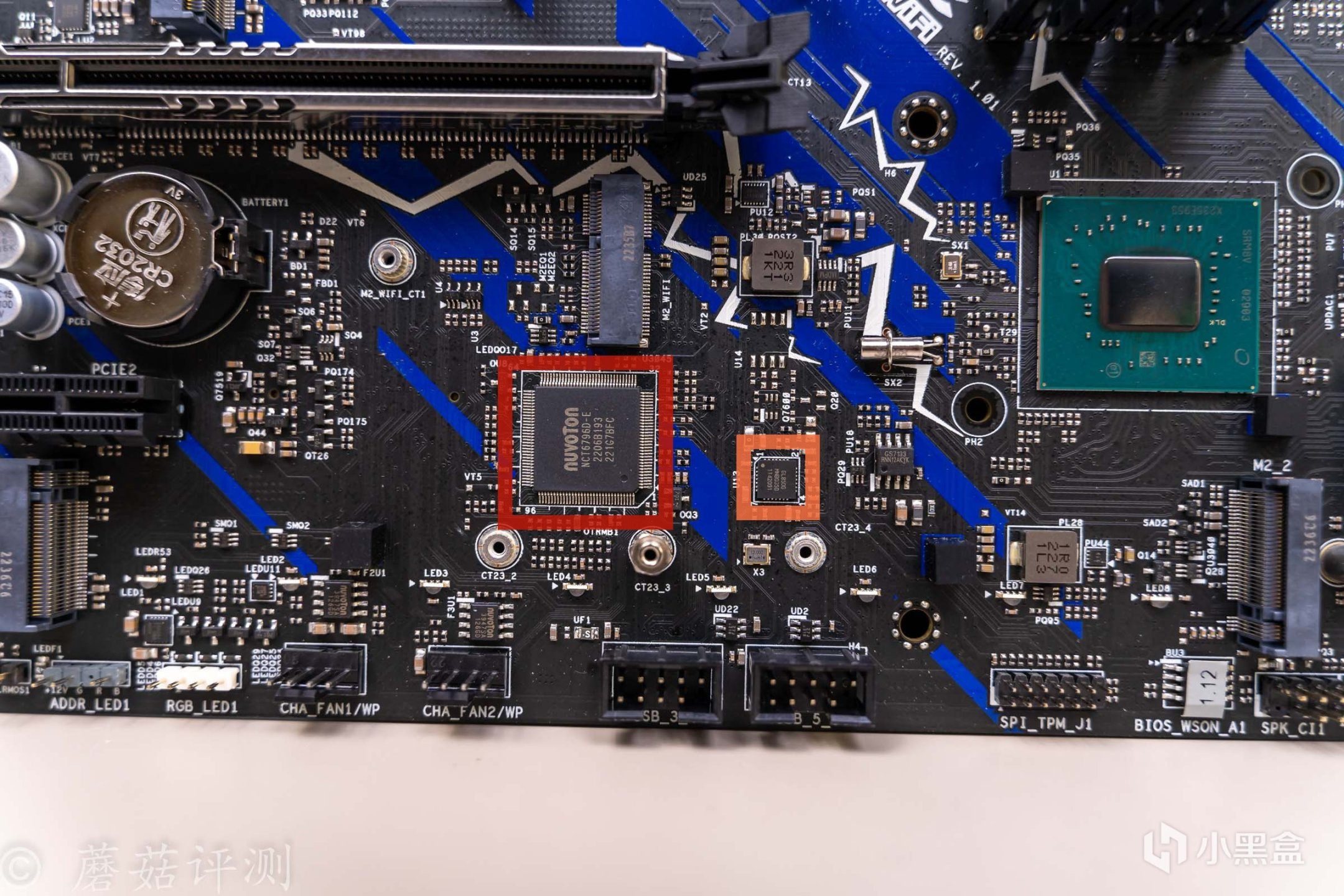 ▼左边红框这颗硕大的芯片丝印NCT6796D,用于检测主板的各项参数;旁边的橙框芯片丝印GL850G,USB 2.0的HUB芯片,给主板底部的两个USB2.0接口提供支持。