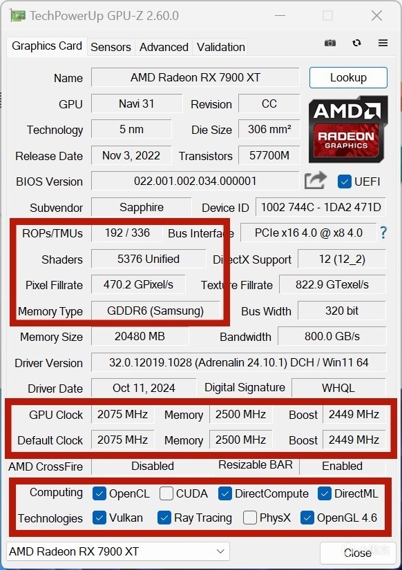 蓝宝石RX7900 XT 20G极地版OC显卡采用的是RDNA 3架构,核心代号为Navi 31,流处理器数为5376;显存为320bit位宽的GDDR6(三星),显存容量为20480MB,显存带宽为800GB/s;GPU默认基础频率2075MHz,Boost频率为2449 MHz。