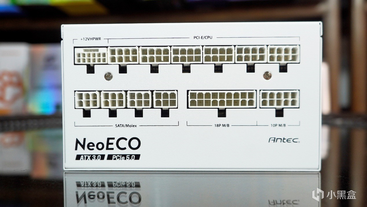 安钛克NE1000模组口分为上下两排,第一排是12+4PIN接口(PCIe5.0)+PCIe供电接口+主板供电接口,第二排是标准CPU供电接口+IDE/SATA供电接口,搭配文字标注方便线材安装。