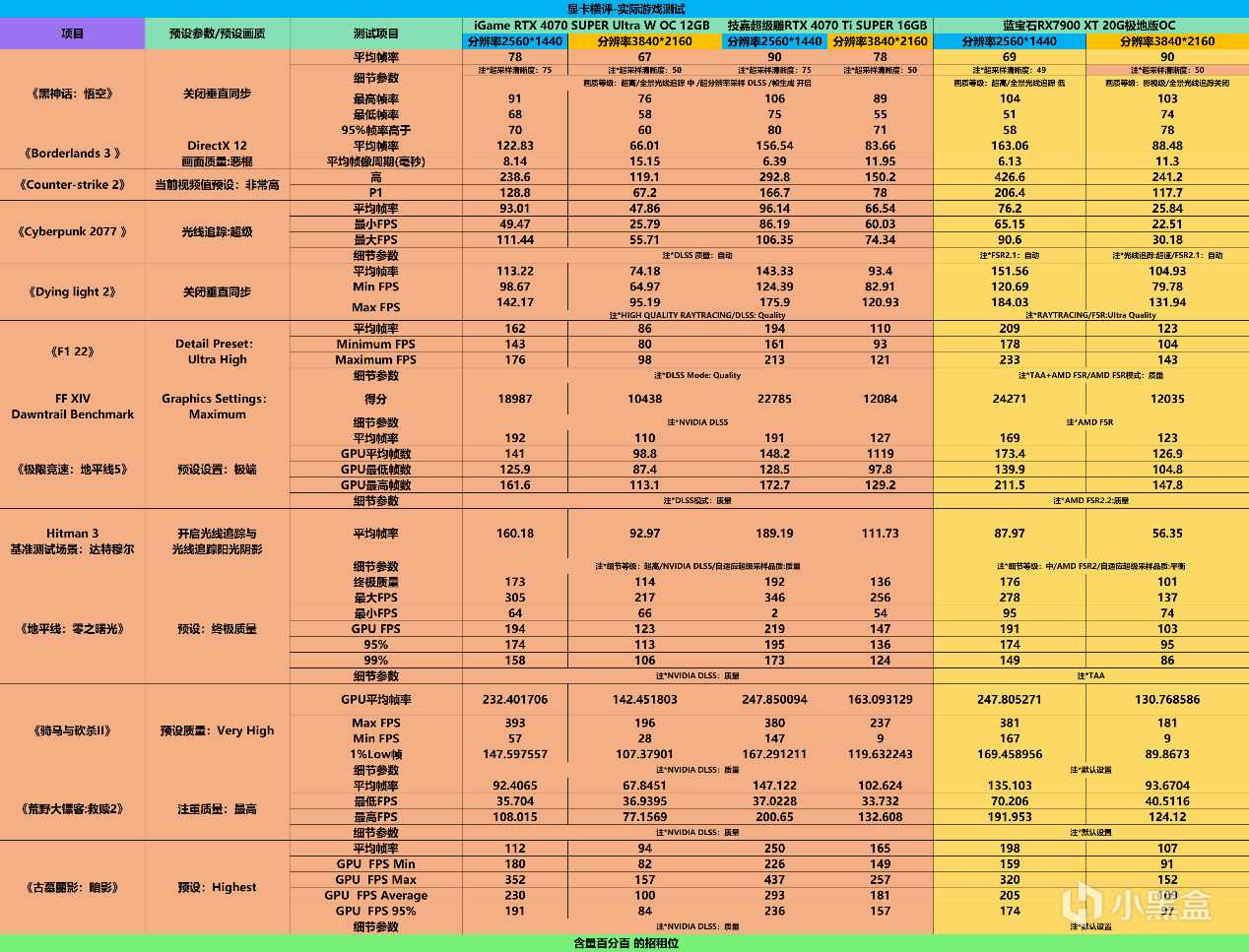 二是单机游戏方面,蓝宝石RX7900 XT 20G极地版OC显卡与其他两款显卡打的有来有回,并非是全面碾压12GB 显存的iGame RTX 4070 SUPER Ultra W OC和16GB显存的技嘉超级雕RTX 4070 Ti SUPER,而且很多游戏里面的参数设置我都选择的是DLSS:质量模式,而不是平衡或是性能模式。