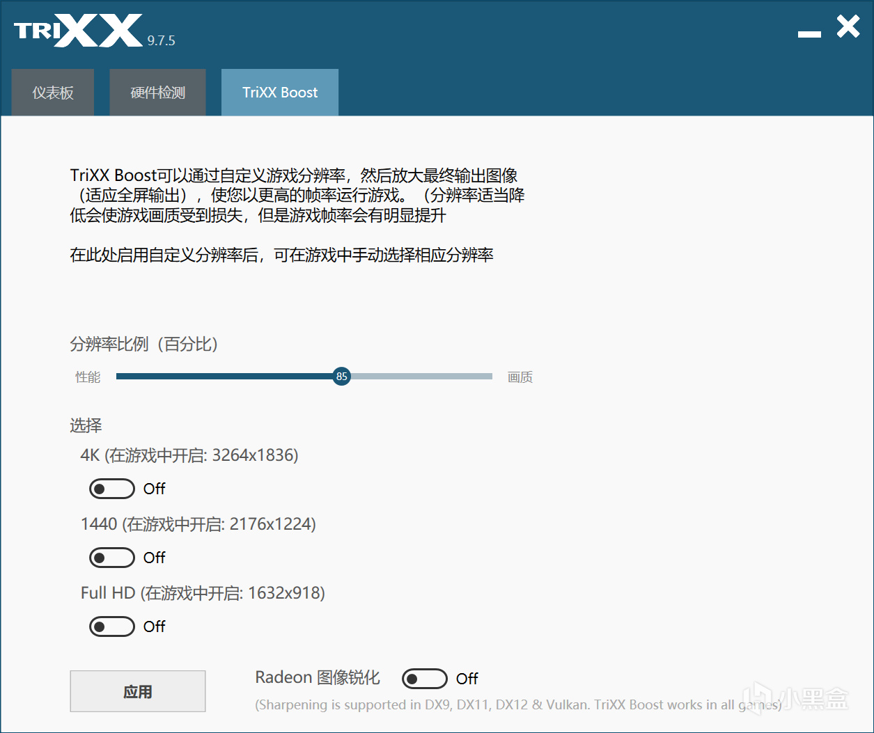 蓝宝石的官方驱动软件是TriXX,包含了仪表盘、硬件监测和TriXX Boost,这里面最实用的其实就是TriXX Boost,搭配图形锐化技术,可以通过调节游戏分辨率来进一步提升游戏帧数,更适合追求高帧率的游戏玩家。