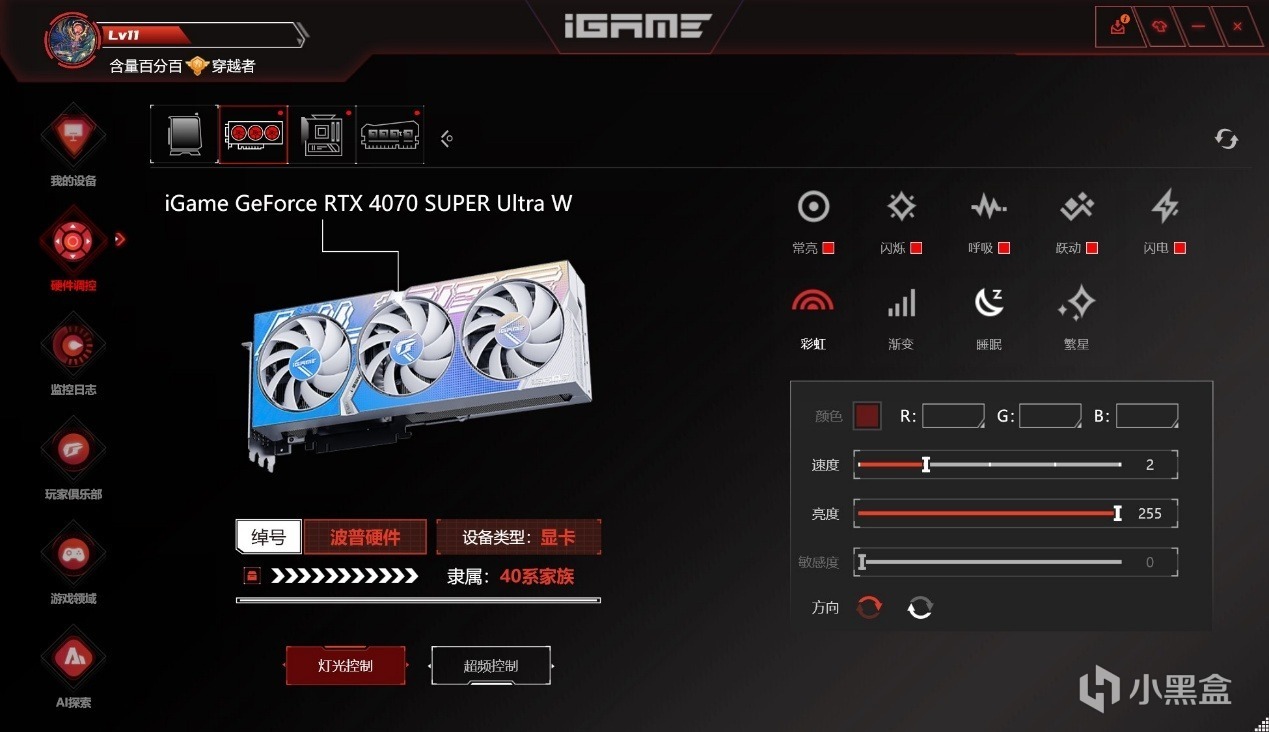 七彩虹显卡的官方驱动软件是iGame Center,可以实时监控电脑硬件的运行状况,包括CPU和显卡的频率、温度、内存使用率等,软件提供手动超频设置,用户可自主调整自己的七彩虹显卡的频率、电压等参数,以获得更高水平的性能表现。同时支持显示屏自定义功能(视具体型号而定)以及RGB灯光控制,可以独立调整显卡、主板、风扇或内存的灯效,实现个性化的灯光风格,也可选择统一的风格进行神光同步。