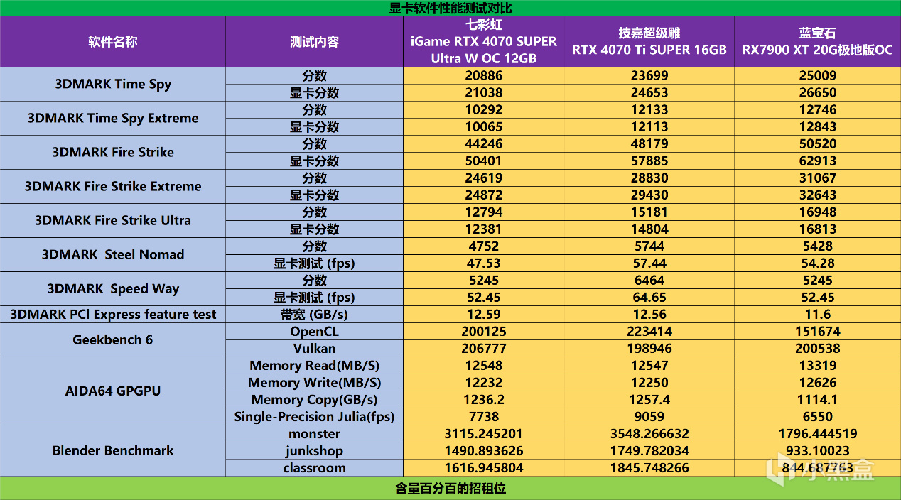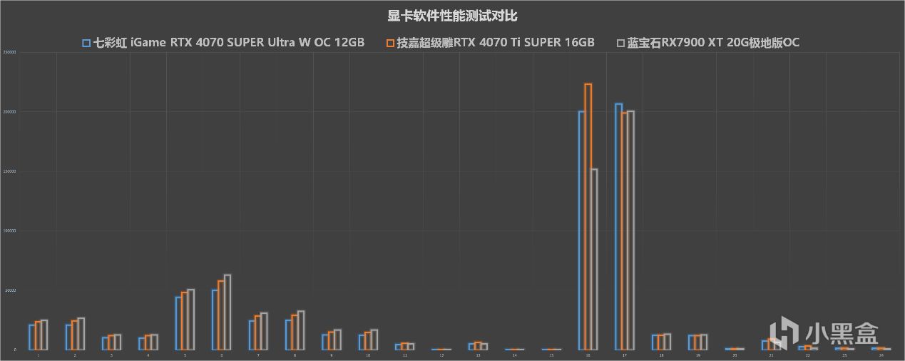 二是蓝宝石RX7900 XT 20G极地版OC显卡和iGame RTX 4070 SUPER Ultra W OC 12GB在Speed Way测试下的成绩相同,均低于技嘉超级雕RTX 4070 Ti SUPER 16GB。