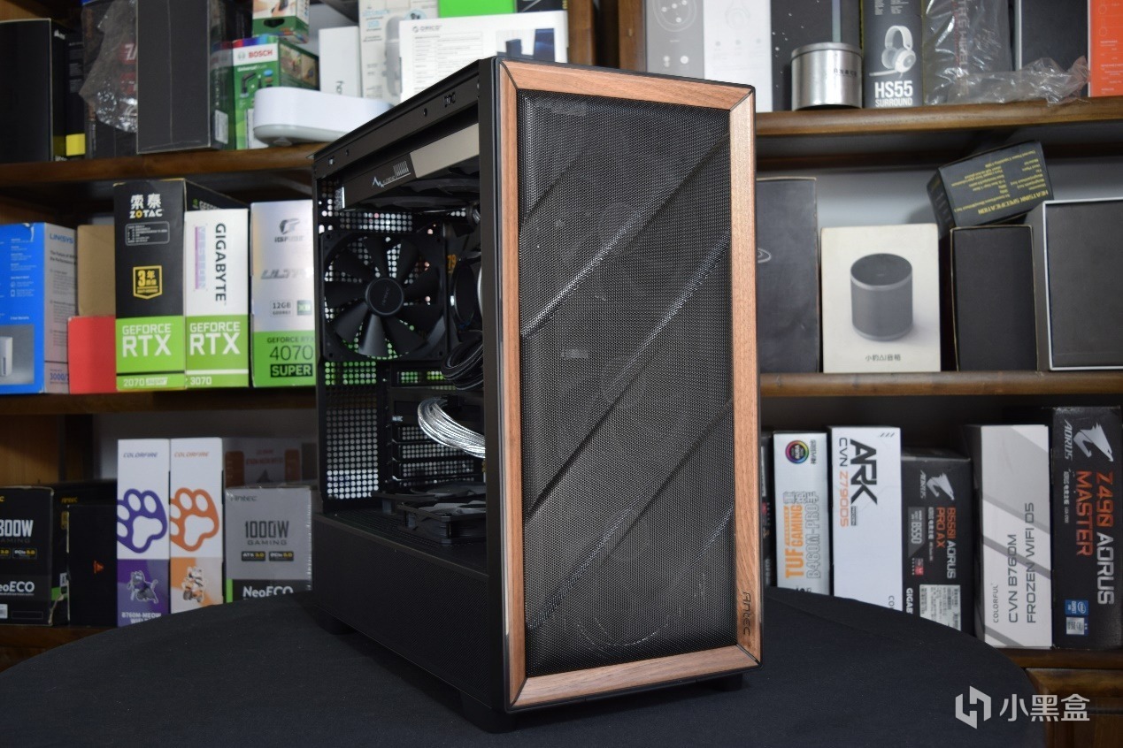 懒得拆白色海景房主机,所以这里就偷懒就搭配空闲的安钛克FLUX机箱,设计上的亮点一是前面板四周加入了木材设计,二是自带5把无光风扇,即前置3把12厘米风扇、后置1把14厘米风扇以及底部1把12厘米反向风扇,基本不用担心内存条超频后的散热问题。