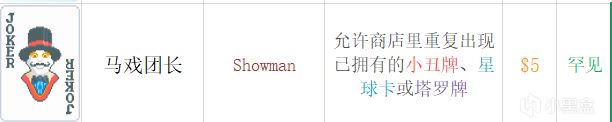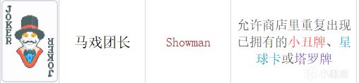 你手上的小丑,消耗牌,以及商店當前的東西不會再出現第二張,除非你有 馬戲團長