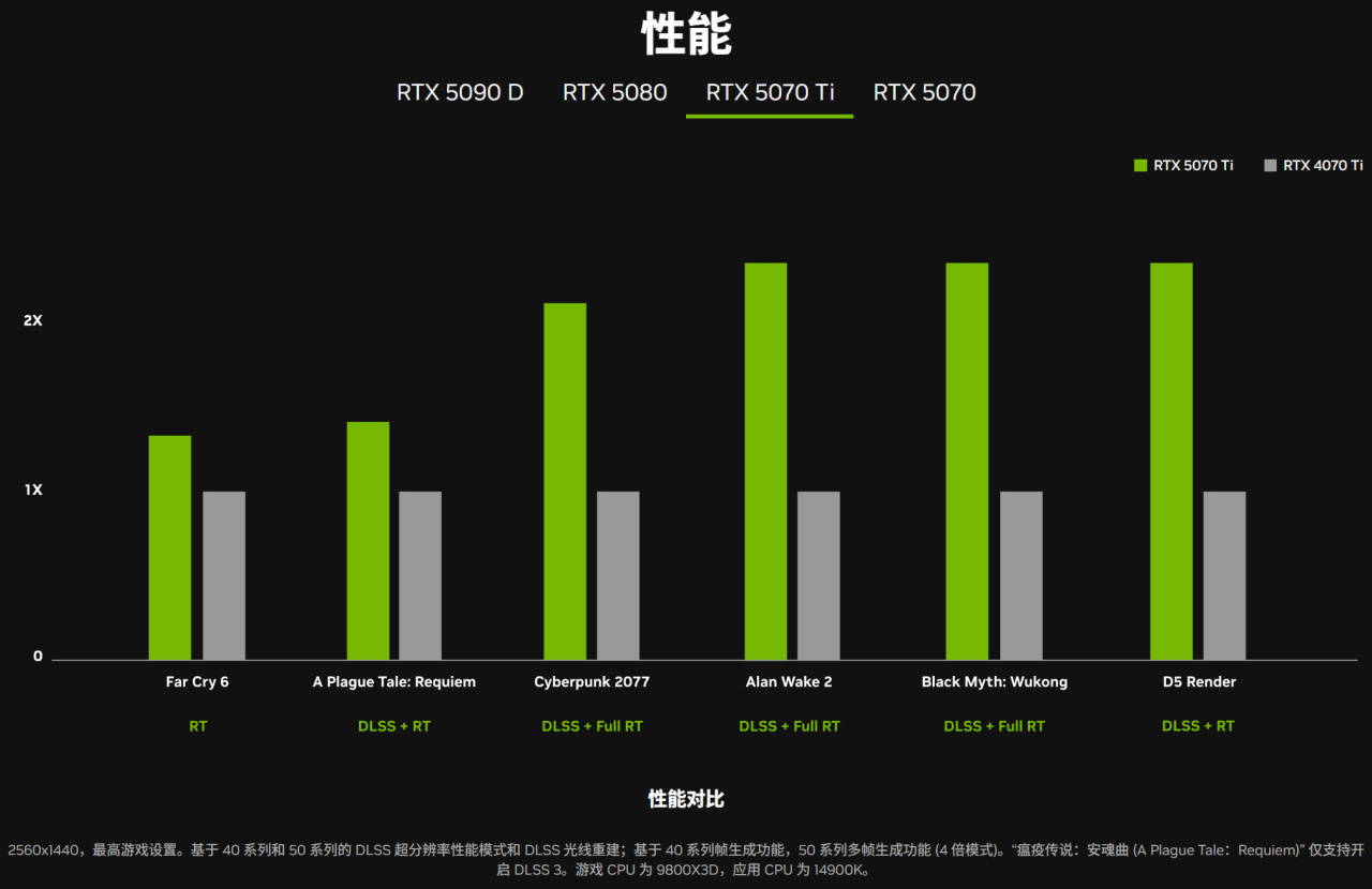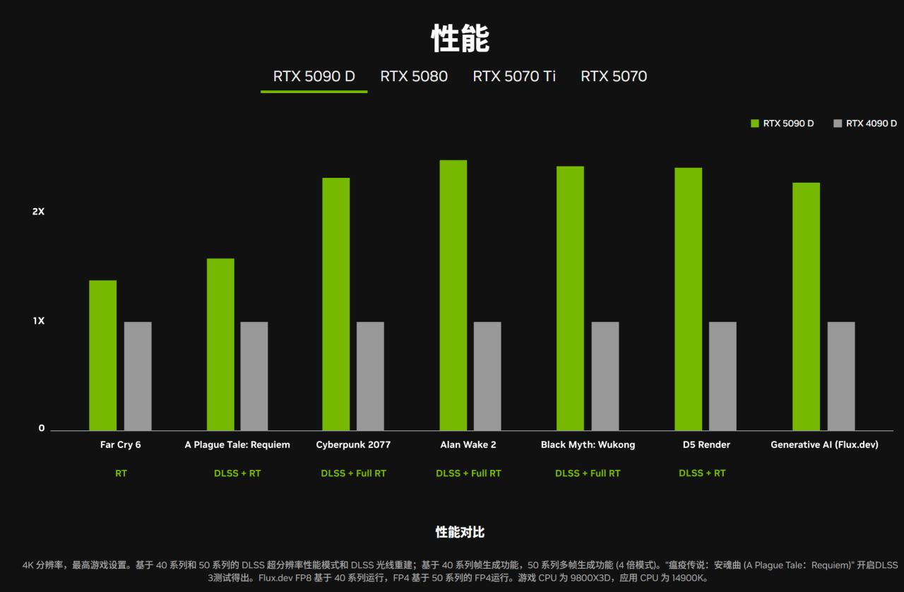 以NVIDIA官方圖表爲基準進行性能推測,下圖左1遊戲-孤島驚魂6,開RTX光追+不開DLSS,5090D大概領先4090D 27% 左右,等我測完給大家說