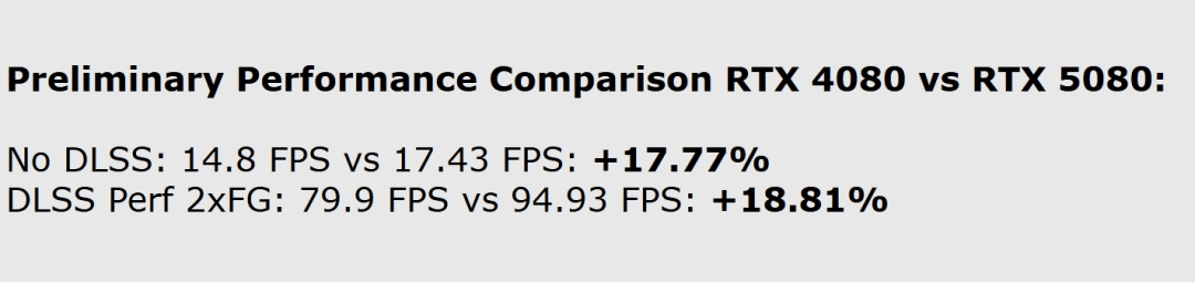 虽然这些结果看起来很有希望,但其性能仅使用了帧生成进行测量,与RTX 5080的实际光栅化性能无关。