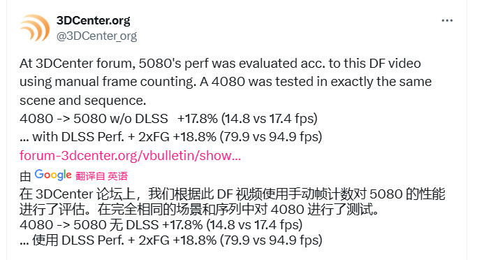 3DCenter论坛上,一位名为Relax的用户根据DF的视频,使用手动帧计数评估了5080的性能。在完全相同的场景下测试了RTX 4080。