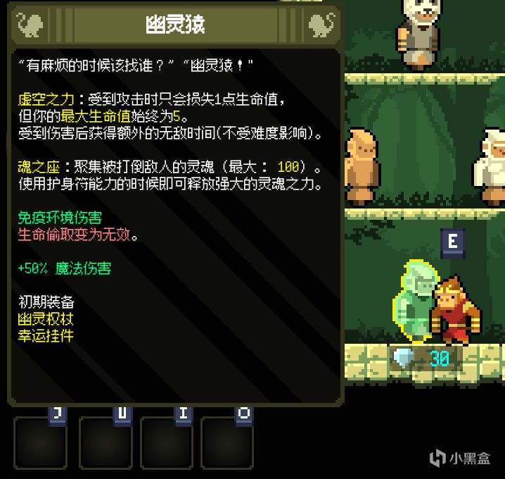 幽灵猿的皮肤属性和外观如下,需要30钻石解锁,最大hp只有5,感觉这个得大佬用吧,我是用不了这个,话说后面千万别出什么全皮肤通关的成就,要是出那个感觉我就完成不了啦