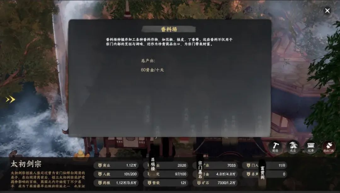 3) 新增資源類型建築:鋸木廠,石料廠,香料場,胭脂坊,珠寶坊,農田,魚塘,牧場,人蔘園,草藥園,煉丹坊,瓷器窯,絲坊,茶葉園,麻田,棉花田,桑田,鐵礦場,銅礦場,煤場;該類型建築用以生產門派資源。