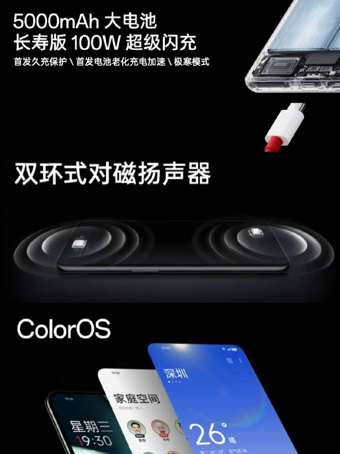 其他方面,一加 11配备 5000mAh 电池,支持长寿版 100W 超级闪充,首发久充保护和老化电池充电加速模式,搭配双环式对磁扬声器,出厂搭载 ColorOS 13。