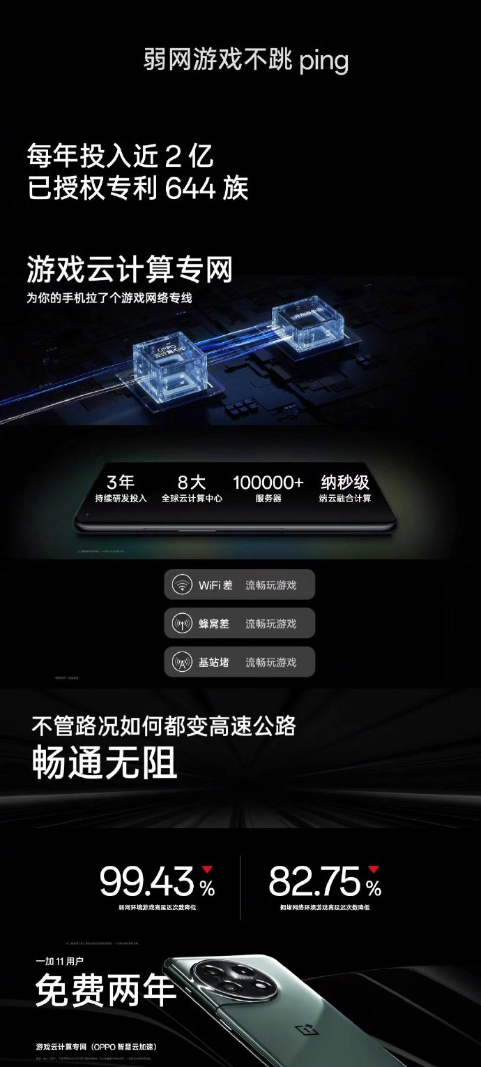 一加 11 将全球首发游戏云计算专网技术:连接 Wi-Fi 时,会启动蜂窝网络并进行纳秒级的数据融合,增强网络质量;只有蜂窝网络时,自动选择最快运营商网络通道;网络拥堵或信号差时,则会通过一加建立的专属通道和服务器,对游戏数据进行传输。在 30 分钟游戏测试,弱网环境的网络高时延次数最高可降低 99.43%。一加称尽管成本高昂,所有一加 11 用户可免费使用此项服务两年。