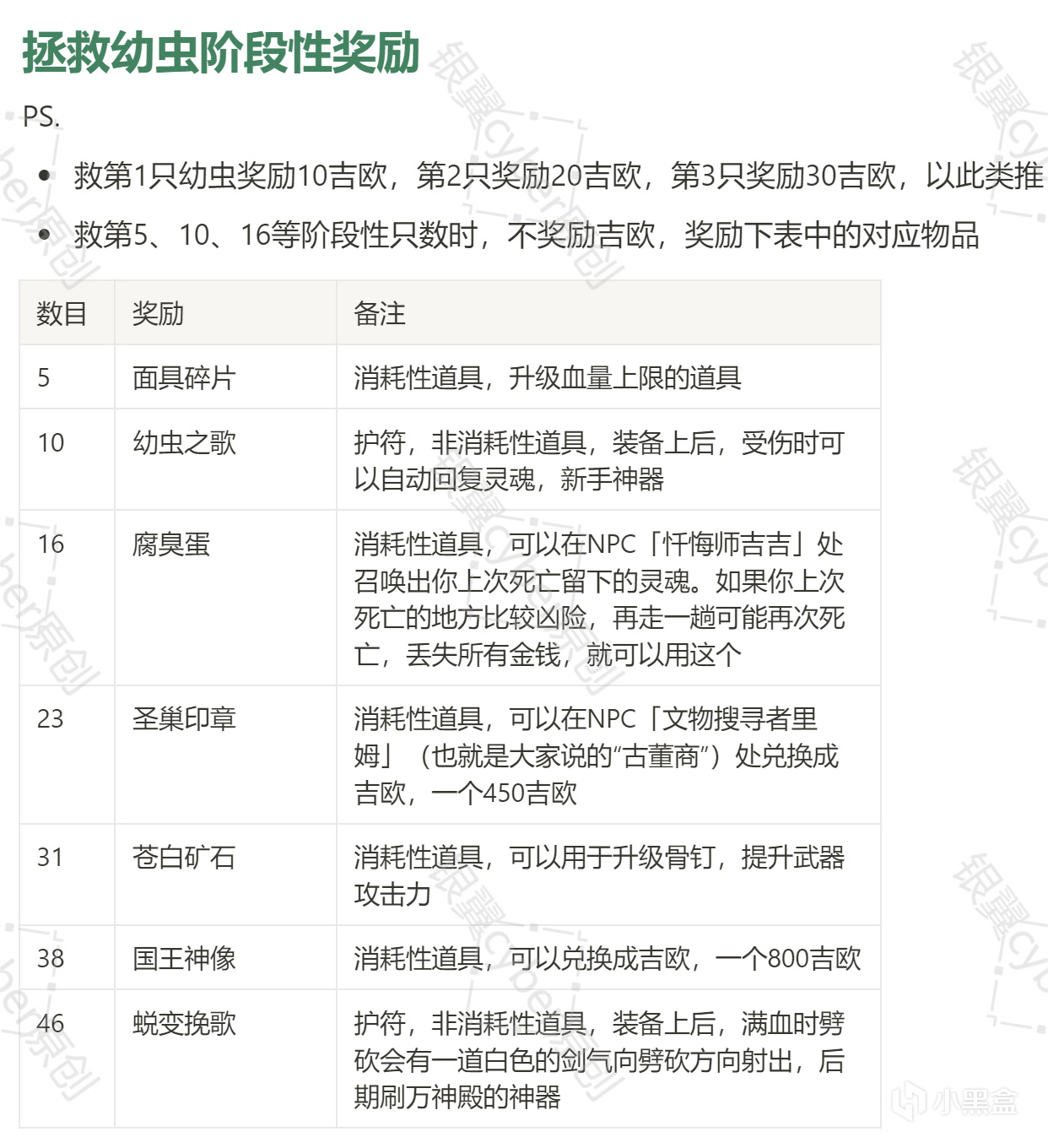 本攻略路線相對更合理,不會缺錢(全程吉歐餘額管理,按至少都能有的餘額來算,你的錢只會比我的多,不會少),升級快(血量、靈魂、骨釘),全程有地圖導航,不會迷路,有裝備建議和BOSS打法。