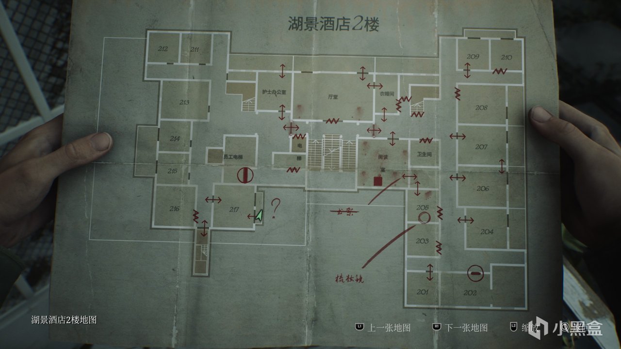 《寂静岭2》的地图会标题存档点、开着&封死&需要钥匙的门、解谜地点、关键物品、角色等等所以你需要的信息,如果是完成了前置解谜还会记录密码,实在是太好用了!