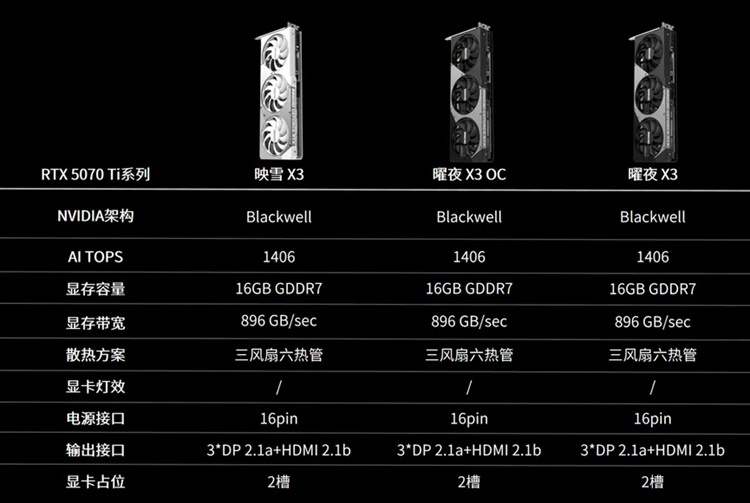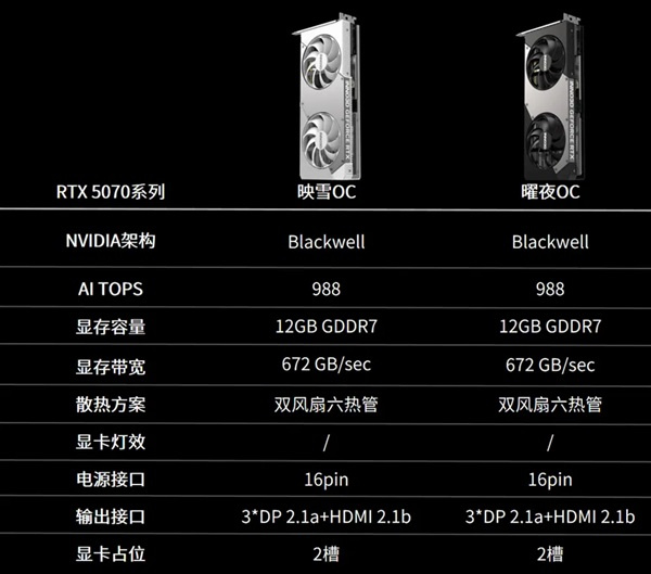 在GeForce RTX 5070上,除了曜夜X3 OC爲三風扇,另外的映雪、曜夜OC、以及曜夜均爲雙風扇。讓桌面空間有需求的ITX小機箱用戶羣體也能體驗到非凡的極致遊戲體驗。