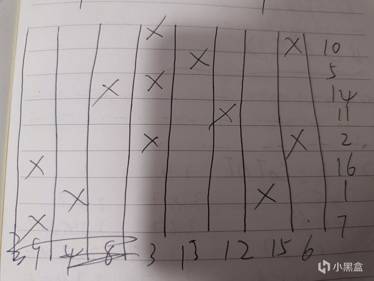 OK,解释完这个接下来就是怎么找坐标了,之所以需要找,是因为地板的坐标是乱序的,所以只能慢慢摸清,我们同屋外不同两个柱子之间互动,这就是输入横纵坐标的过程,此时若有地板亮起,则证明一横一纵,若未亮,则两个都是横坐标或纵坐标。这个其实原理简单,只是过程繁琐,大家慢慢找就好,建议在本子上稍微写写画画,方便记录