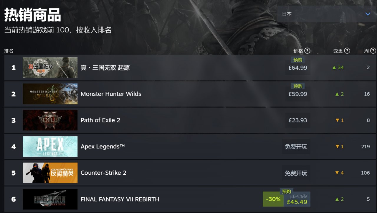 目前《真·三國無雙 起源》已成爲國區、日區、全球等多地區除免費遊戲和Steam Deck外最熱銷作品,在美區也僅次於《流放之路2》。