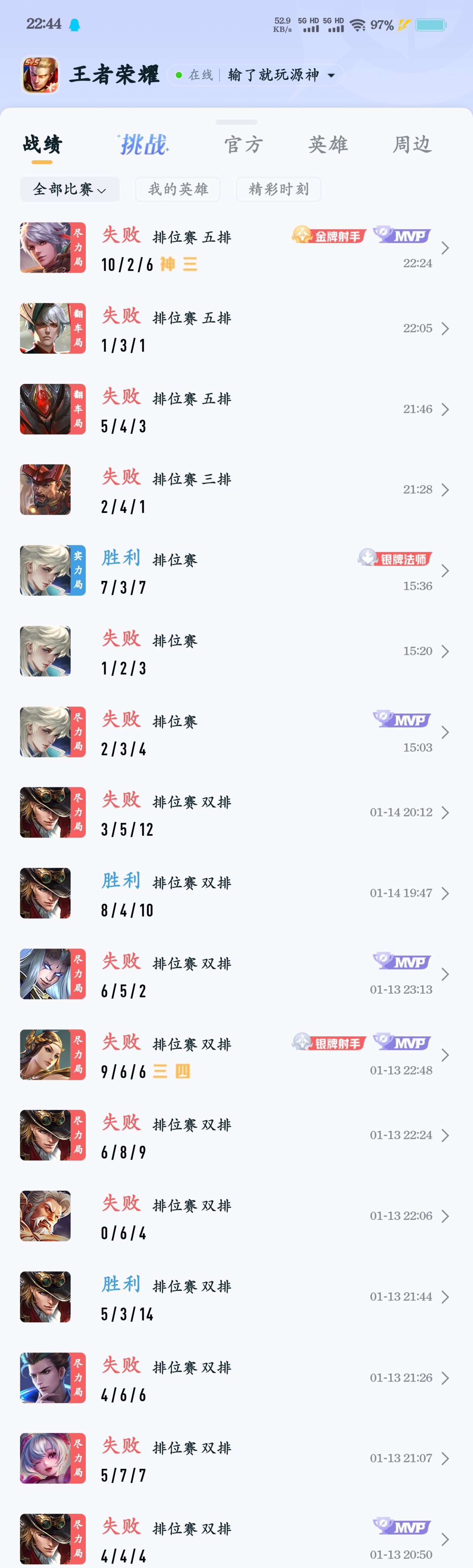 24年磊哥橫空出世,一套雞爪流打的策劃狼狽不堪,我也真正意識到了我玩了9年的遊戲是多麼大的一個笑話,入機故意操控勝率,評分高就有必輸局,累了,圖4是我最近的戰績,17把只贏了3局,可能有人要說是我玩的很菜,所以輸,我不否認,我綜合評分只有79,勝率40多,我是玩的不行,是很菜,沒有拿過國標,只是個普通玩家,你怎麼說都沒有關係,輸贏早就不看實力了,看機制,王者榮耀青天大老爺想讓你贏你就贏,想讓你輸你就輸,正常玩就是贏不了,認真玩還是贏不了,輸了一大堆,擺爛!然後贏了,我相信很多人也遇到過吧