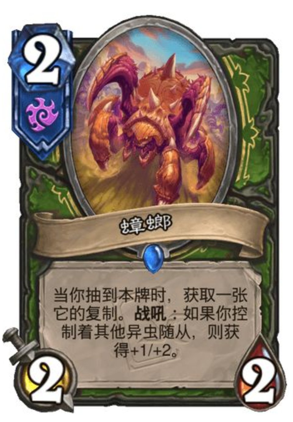 当你抽到本牌时,获取一张它的复制。战吼:如果你控制着其他异虫随从,则获得+1/+2。