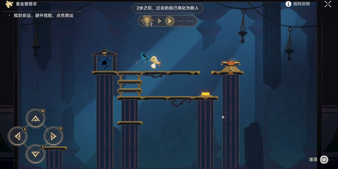 遊戲的玩法很簡單,玩家需要預設自己走過的步數,達到對應步數後第二個角色“過去的自己”就會出現,重複走一遍玩家之前走過的對應步數。在這個過程中,玩家不可以撞到過去的自己,然後在這個基礎上運用過去的自己解開機關,通關關卡。