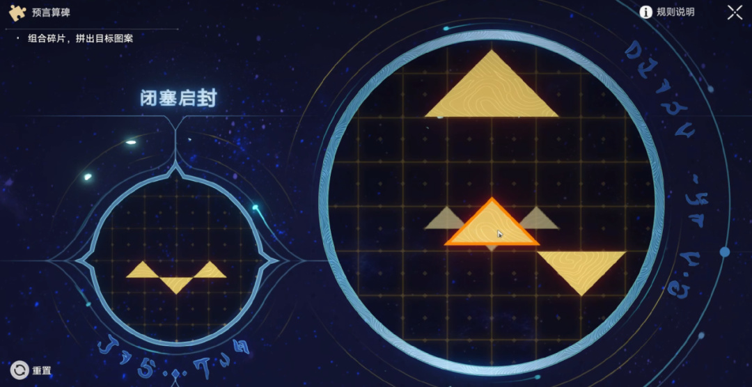 至於預言算碑,這是一個益智拼疊遊戲。通關條件就是將給出的圖形組合成特定的樣子,重疊部分會變成空心,沒重疊的部分則呈現黃色,因爲比較簡單就不花篇幅介紹了。