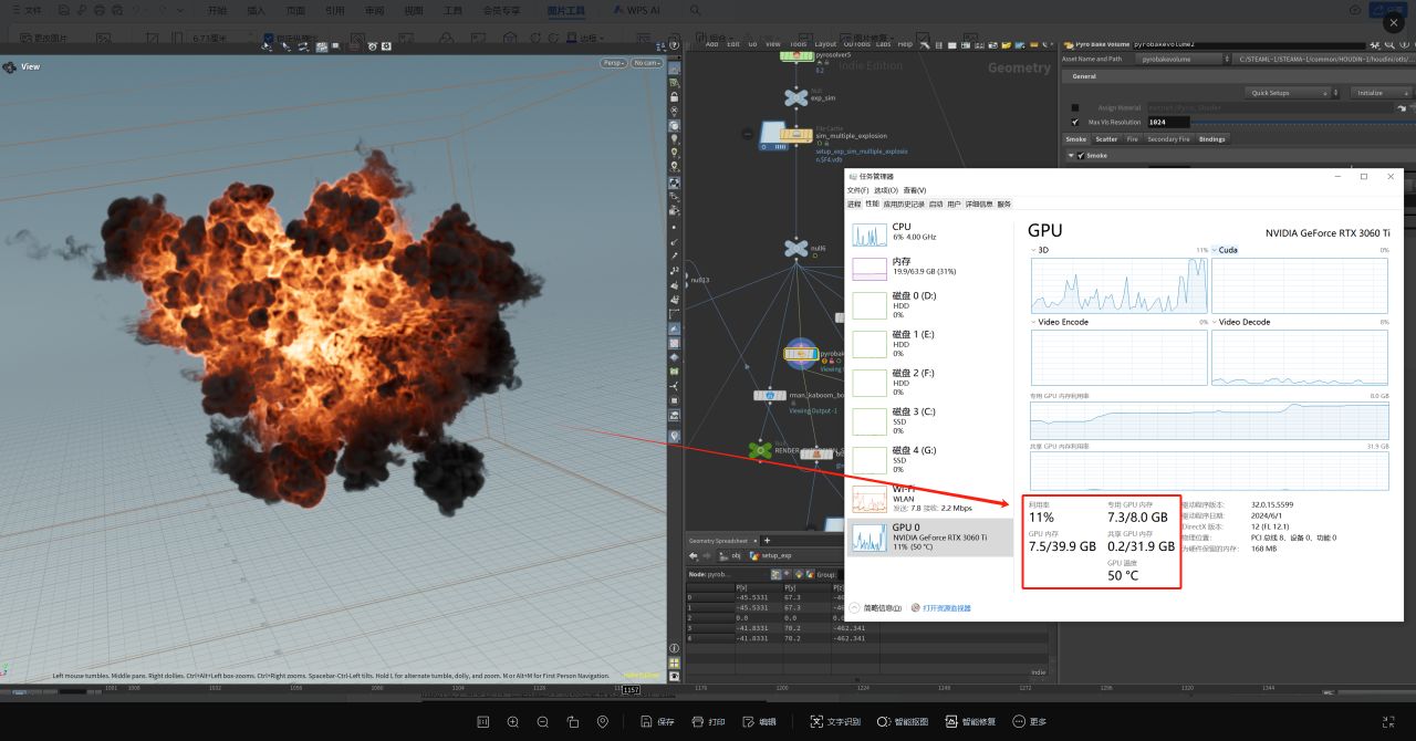 下面是一个爆炸的场面,当你预览这个爆炸的场景时,显卡也在后台默默工作,渲染火光、生成烟雾......