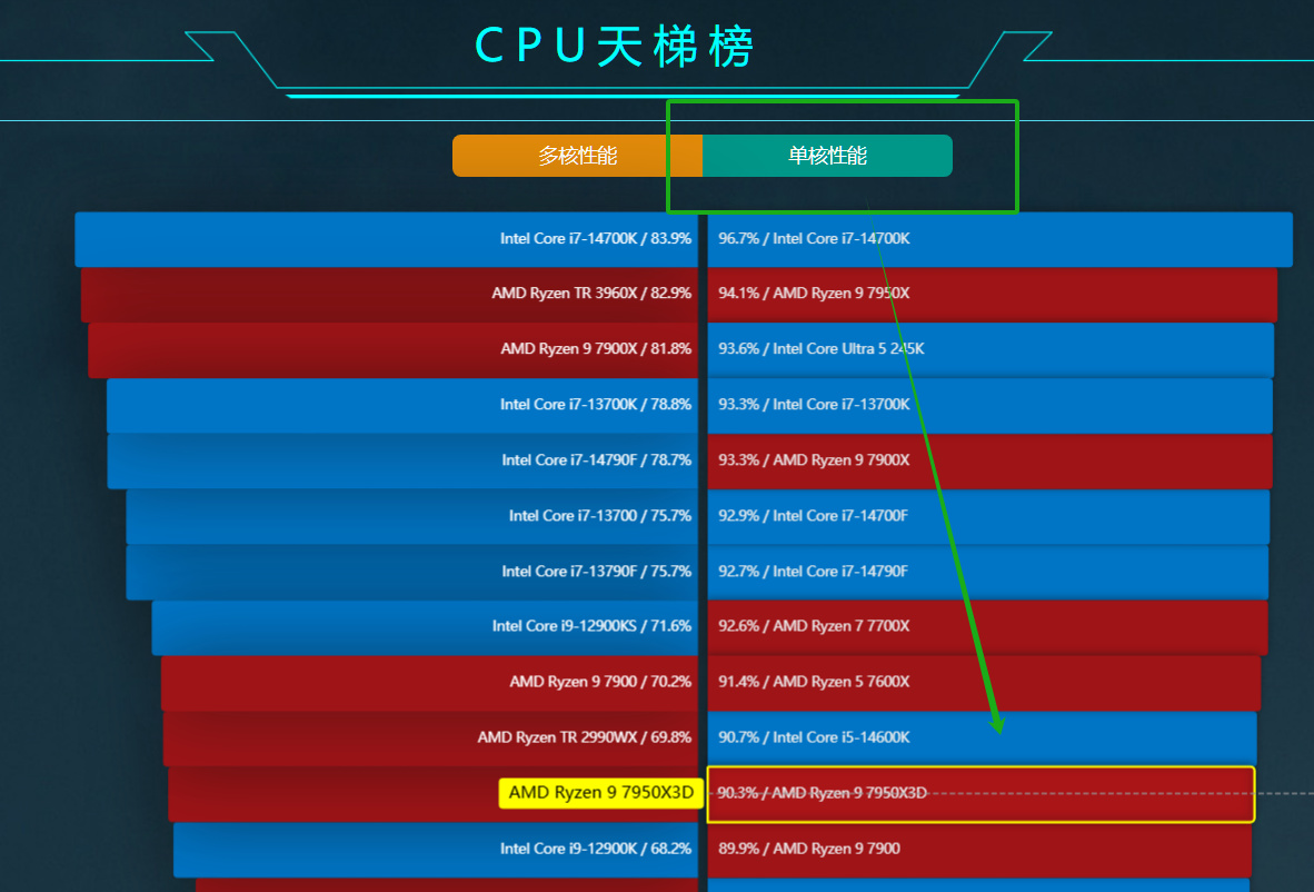 那么什么CPU单核性能强呢?这个就得看硬件的实际评测,像极速空间有做CPU核心效率图: