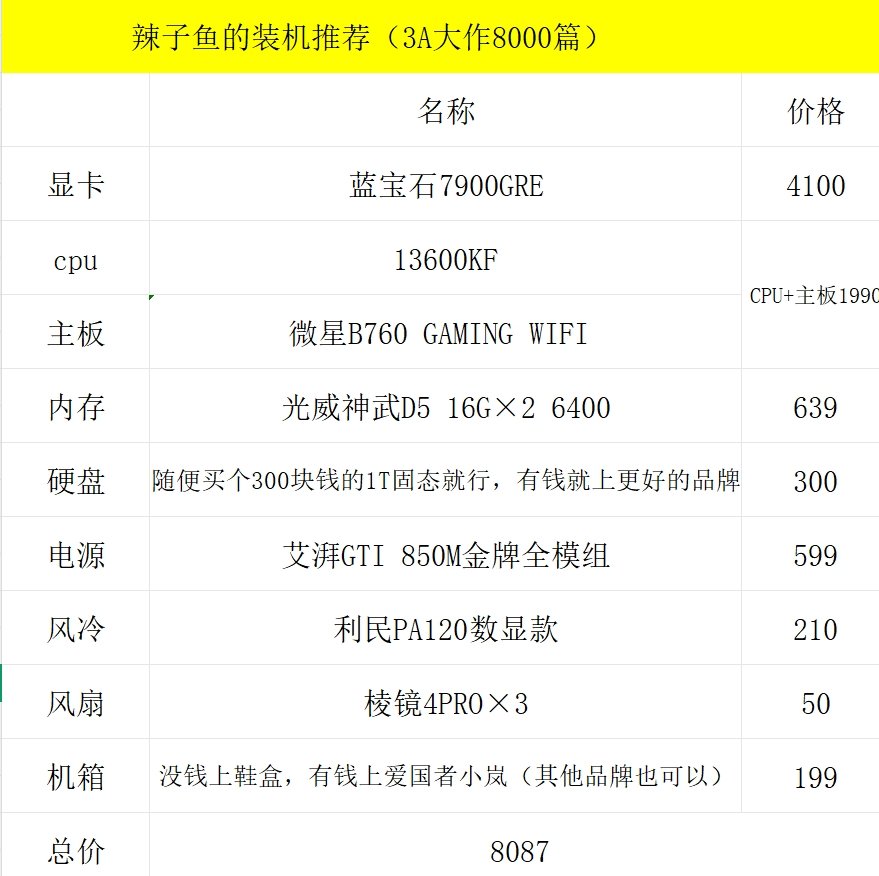 大家好,这里是辣子鱼。这不马上就要新年了嘛,相信不少盒友现在也才十七八岁。在过年拿到零花钱后可能会想要配一台新电脑,那么刚好想到这个问题就想着刚好水一期吧今天就给大家带来一个性价比比较高的主机配置清单