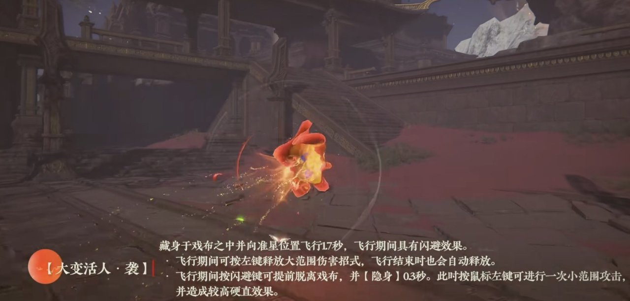 - 飛行期間按Shift可提前脫離戲布,並【隱身】0.3秒。此時按鼠標左鍵可進行一次小範圍攻擊,並造成較高硬直效果。
