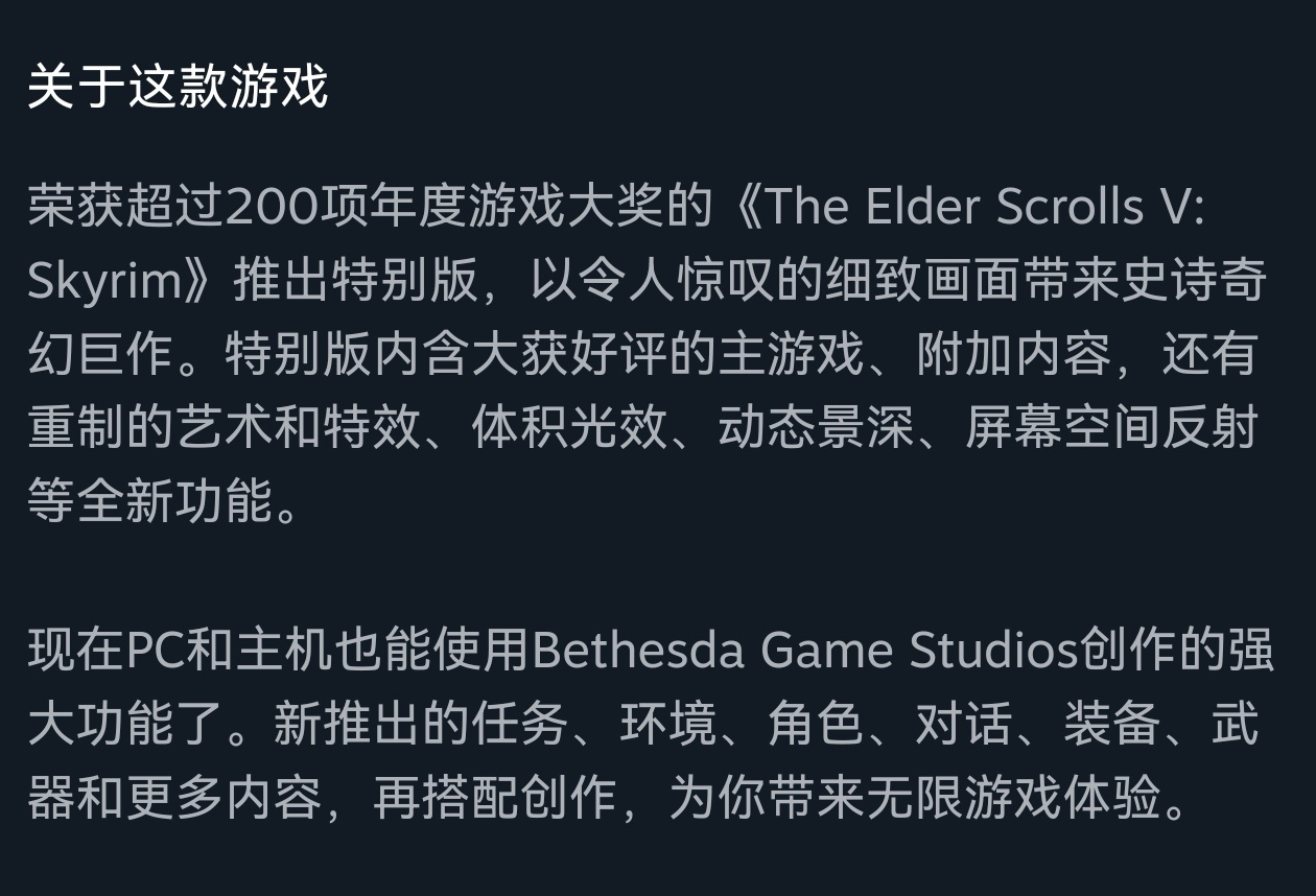 现在的老滚5玩家一般都是玩这款天际特别版了,相比原作增强了画质与光线。