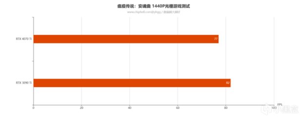 瘟疫传说:安魂曲 游戏中,RTX 4070Ti 平均帧率 77 FPS,RTX 3090Ti 82 FPS,3090Ti 高于 4070Ti 5 帧。