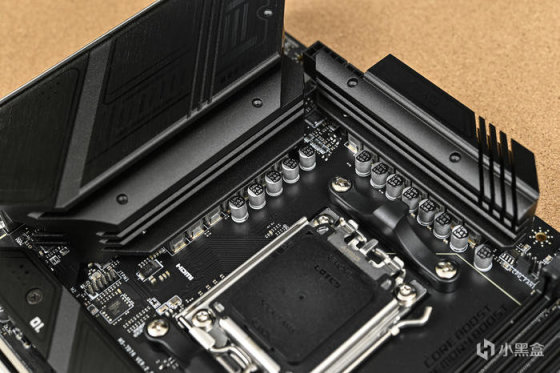 主板来自微星 MAG B650M MORTAR WIFI 迫击炮主板。标准 M-ATX 版型(243x243mm),和上一代银色散热装甲相比改为了灰黑色风格,并且增加了大量斜纹切割线条的装饰,很有金属质感。