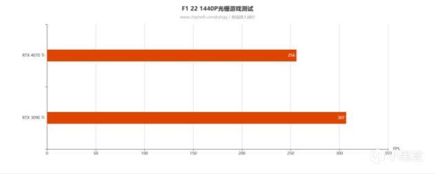 F1 22 游戏中,RTX 4070Ti 平均帧率 256 FPS,RTX 3090Ti 307 FPS,3090Ti 高于 4070Ti 51 帧。