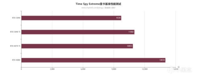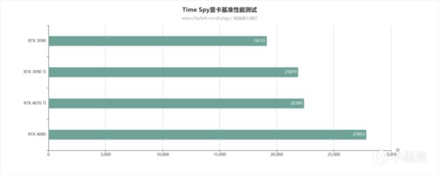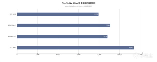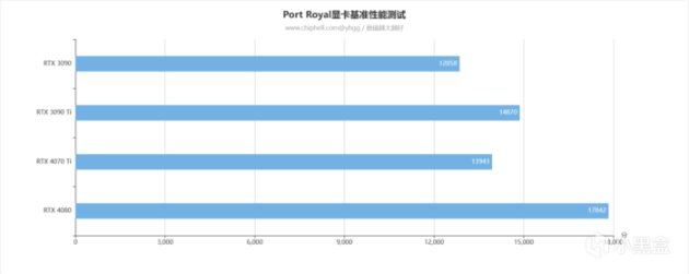 基准测试横向测试了四款显卡,除了影驰 GeForce RTX 4070Ti 12GB 星曜 OC 外,引入三款显卡,分别是 RTX 3090、RTX 3090Ti、RTX 4080。其中Port Royal是测试的显卡实时光线追踪的性能指数,Fire Strike Extreme测试显卡 2K 分辨率下 DX11 游戏性能,Fire Strike Ultra 测试显卡 4K 分辨率下 DX11 游戏性能,Time Spy 测试显卡2K 分辨率下 DX12 游戏性能,、Time Spy Extreme 测试显卡 4K 分辨率下游戏性能。以下做了几个柱形图作为直观参考,所有数值均采用显卡单向得分。可以看到 RTX 4070Ti 虽然在 4K 分辨率下和拥有24GB显存高带宽的 RTX 3090Ti 略有差距,在 2K 分辨率下整体是要好于 RTX 3090 Ti 的性能表现的。