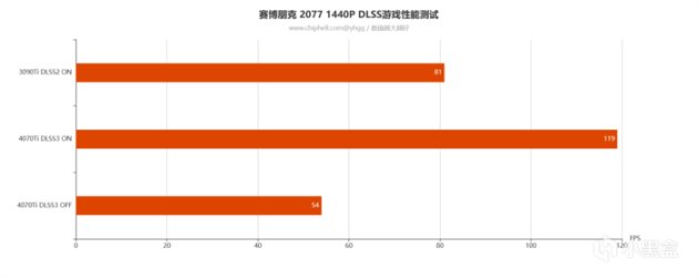 赛博朋克 2077 游戏中,RTX 4070Ti 开启 DLSS 3 平均帧率 119 FPS,关闭 DLSS 3 54 FPS;RTX 3090Ti 开启 DLSS 2 平均帧率 81 FPS。开启 DLSS 3 的 RTX 4070Ti 领先 RTX 3090Ti 多达 37 帧。