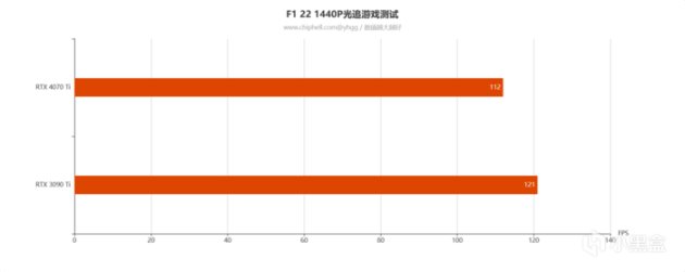 F1 22 游戏中,RTX 4070Ti 平均帧率 112 FPS,RTX 3090Ti 121 FPS,3090Ti 高于 4070Ti 9 帧。