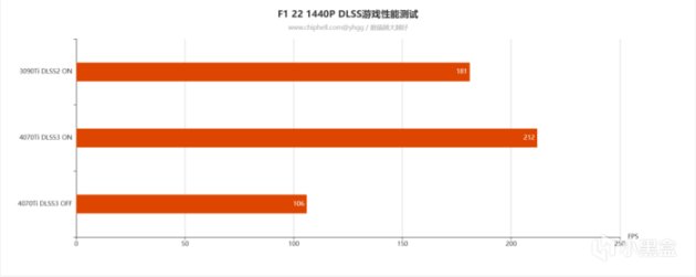 F1 22 游戏中,RTX 4070Ti 开启 DLSS 3 平均帧率 212 FPS,关闭 DLSS 3 106 FPS;RTX 3090Ti 开启 DLSS 2 平均帧率 181 FPS。开启 DLSS 3 的 RTX 4070Ti 领先 RTX 3090Ti 多达 31 帧。