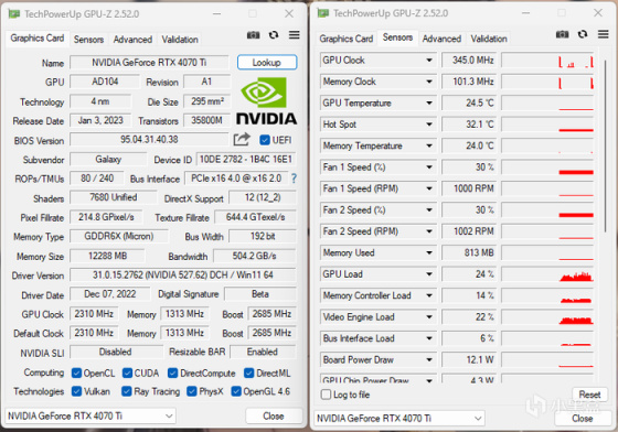 影驰 GeForce RTX 4070Ti 12GB 星曜 OC GPU-Z信息。具有 7680 个 CUDA 核心, 可提供 40 个 Shader TFLOPS,93 个 RT-TFLOPS、641 个 Tensor FLOPS 以及 12 GB 高速镁光 GDDR6X 显存。