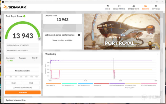 3D Mark 基准性能测试方面,影驰 GeForce RTX 4070Ti 12GB 星曜 OC Port Royal 测试得分 13943 分。