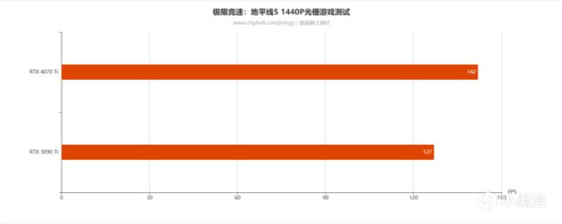 极限竞速:地平线5 游戏中,RTX 4070Ti 平均帧率 142 FPS,RTX 3090Ti 127 FPS,4070Ti 高于 3090Ti 15 帧。